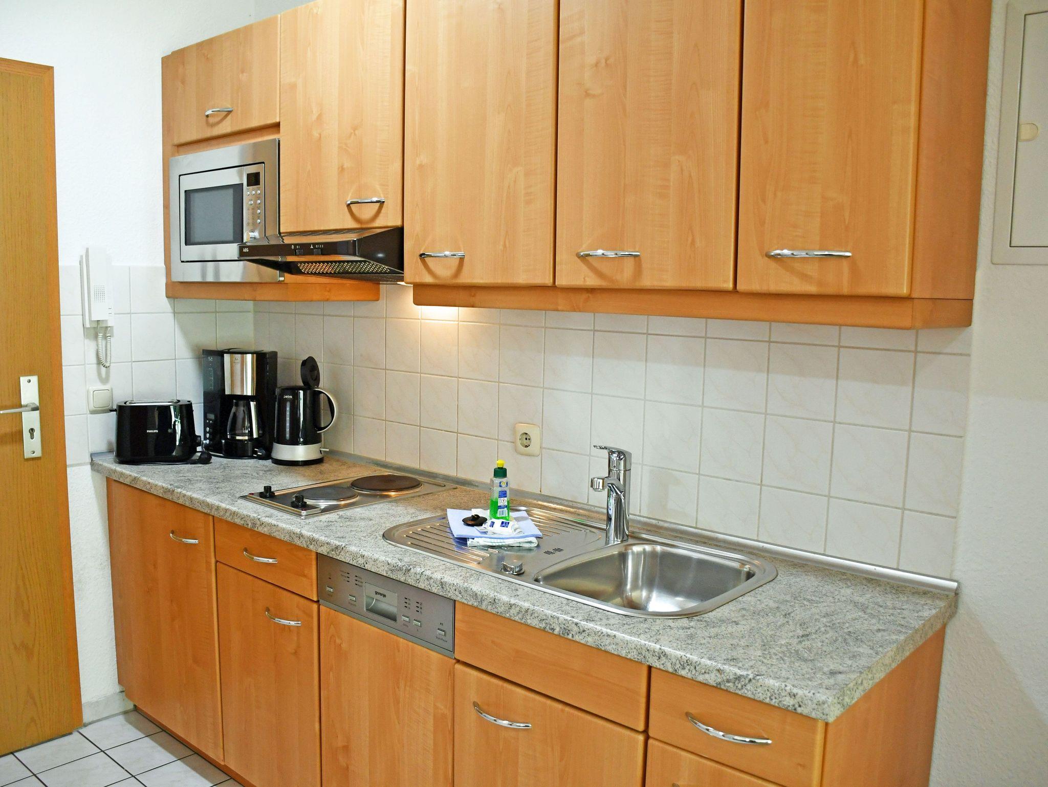 Im Wohnraum integrierte Einbauküche, ausgestattet mit: 2-Platten-Kochfeld, Mikrowelle, Dunstabzugshaube, Kühlschrank mit Gefrierfach, Geschirrspüler, Toaster, Kaffeemaschine, Wasserkocher und Küchenutensilien
