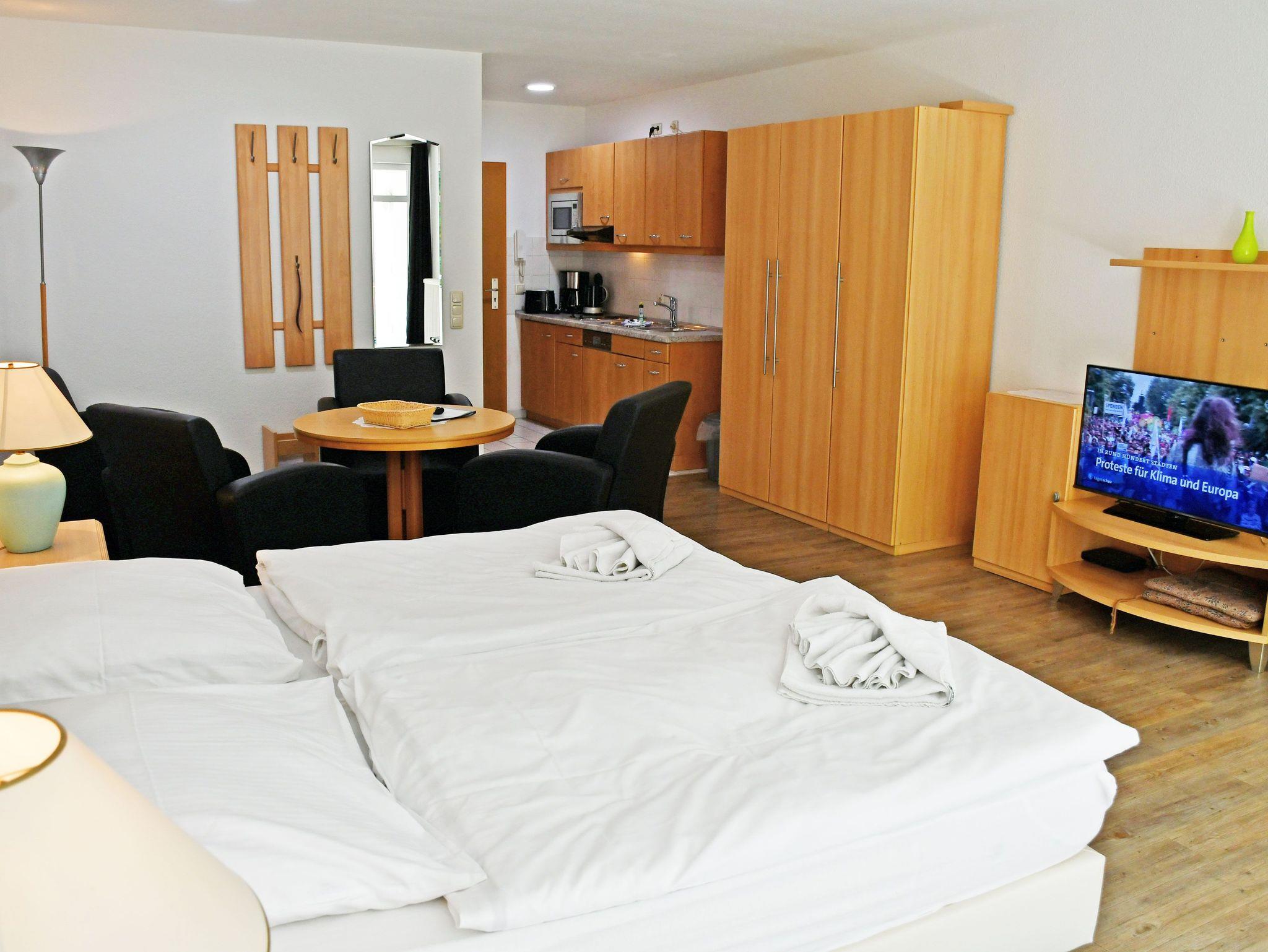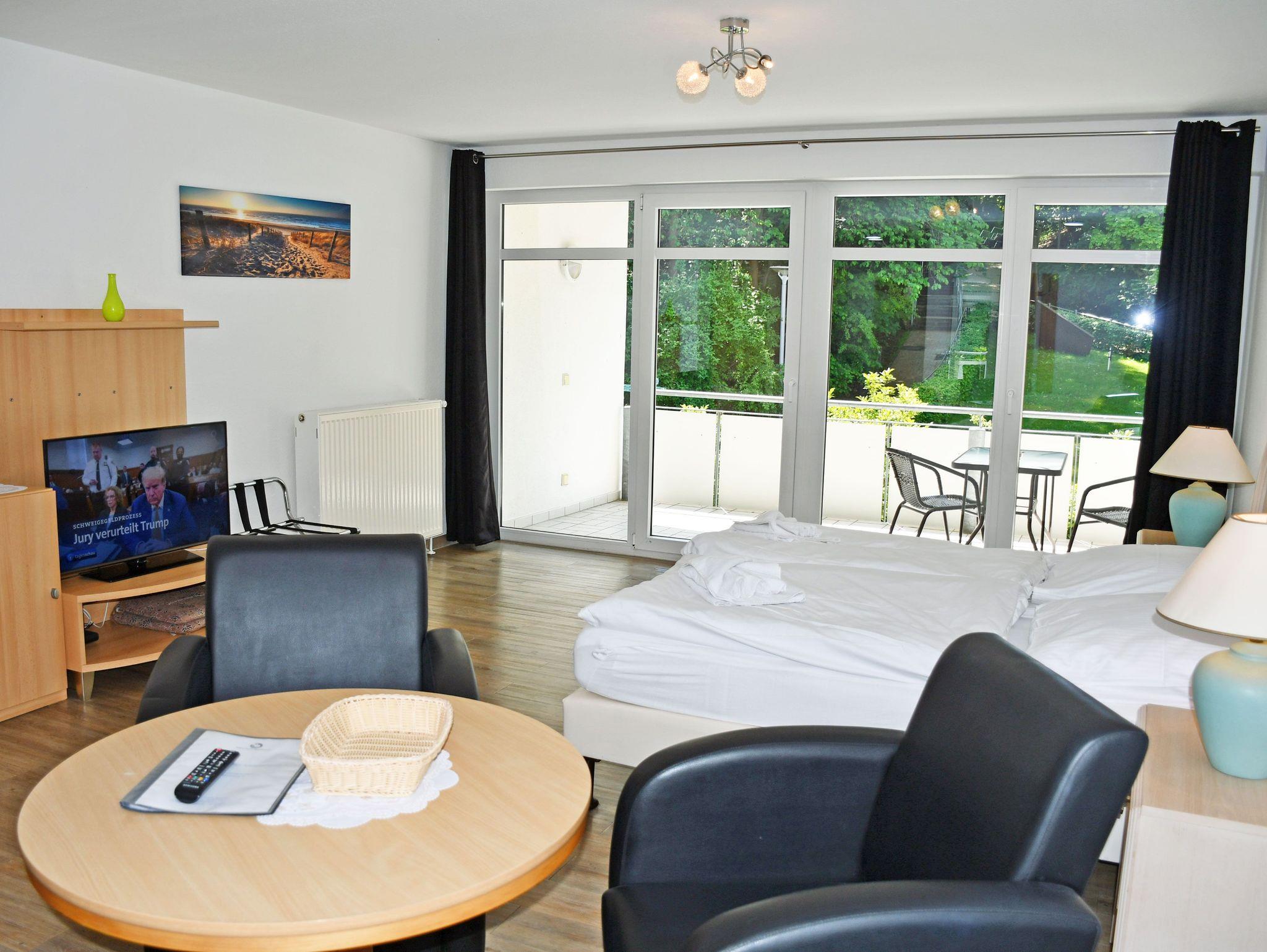 Unsere ruhig gelegenen, hellen und lichtdurchfluteten 1-Raum-Ferienwohnungen mit Balkon sind wie folgt ausgestattet: