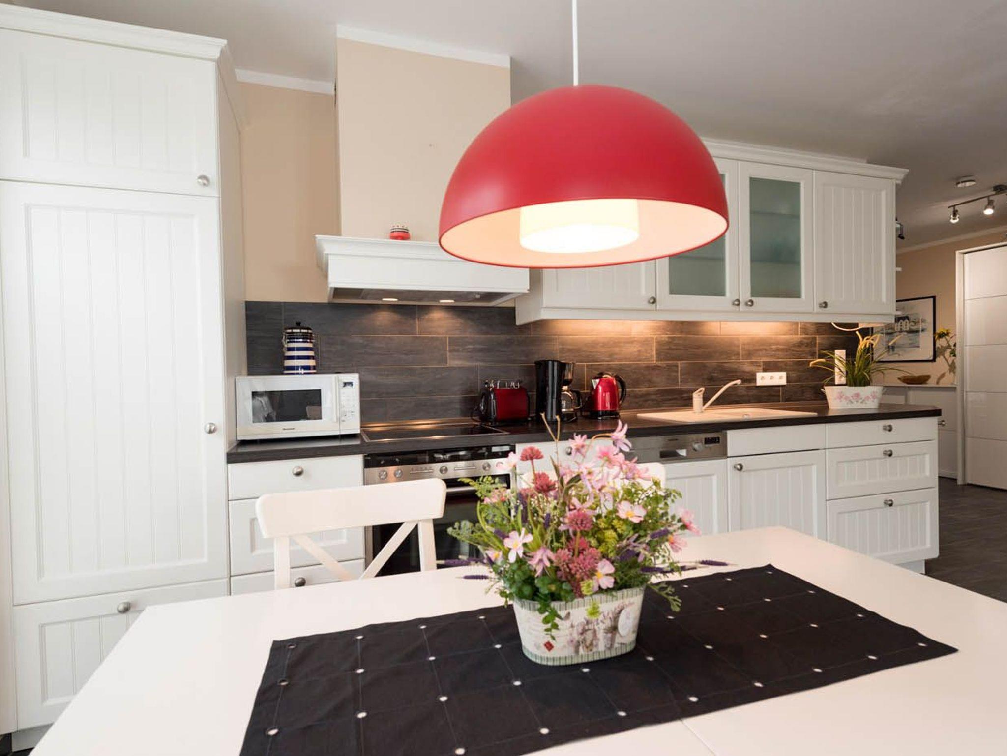 4-Platten-Cerankochfeld, Backofen, Dunstabzugshaube, Mikrowelle, großer Kühlschrank mit Gefrierfach, Geschirrspüler, Toaster, Kaffeemaschine, Wasserkocher, Eierkocher und hochwertigen Küchenutensilien