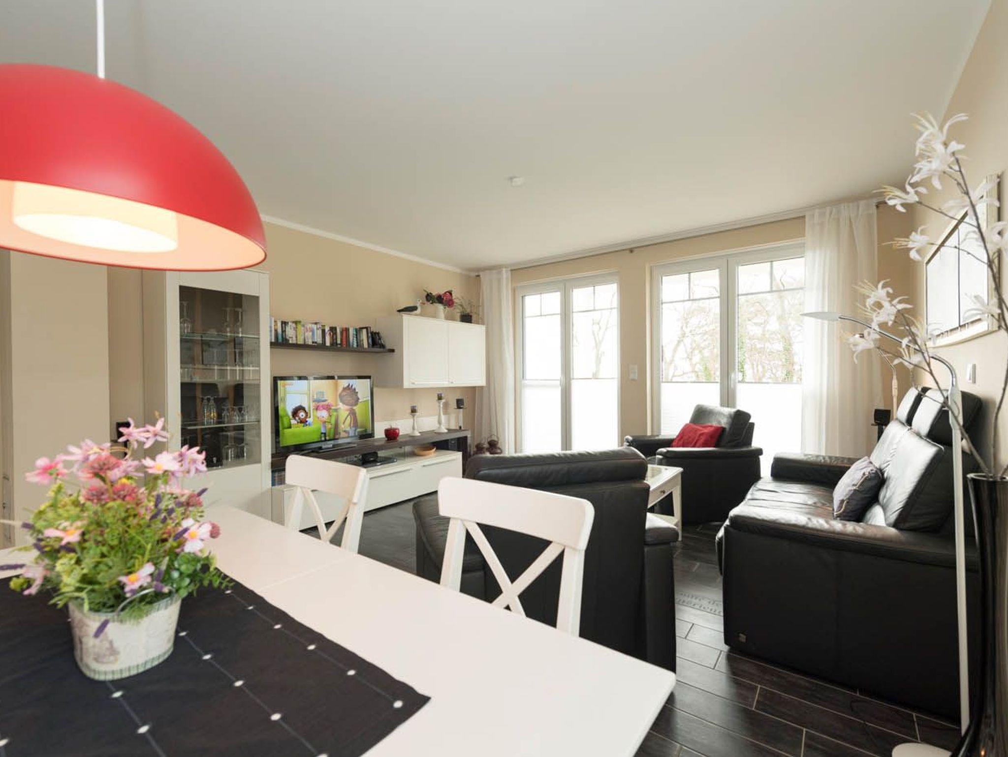 * Großzügiger Wohnbereich mit Ledersitzgarnitur und Couchtisch, Anrichte mit großem Flat-TV sowie CD-Radio-Anlage, Esstisch mit 4 Stühle.