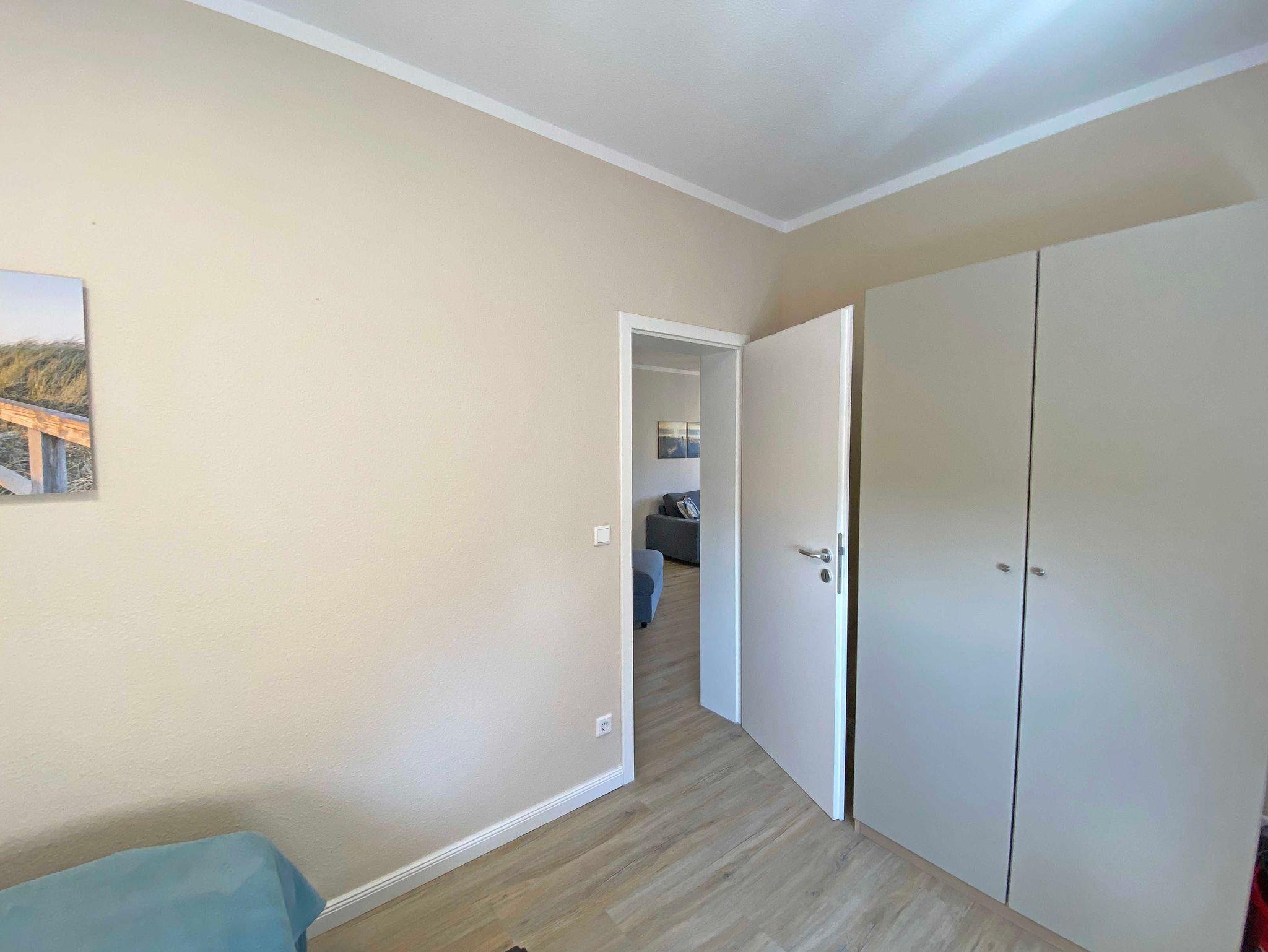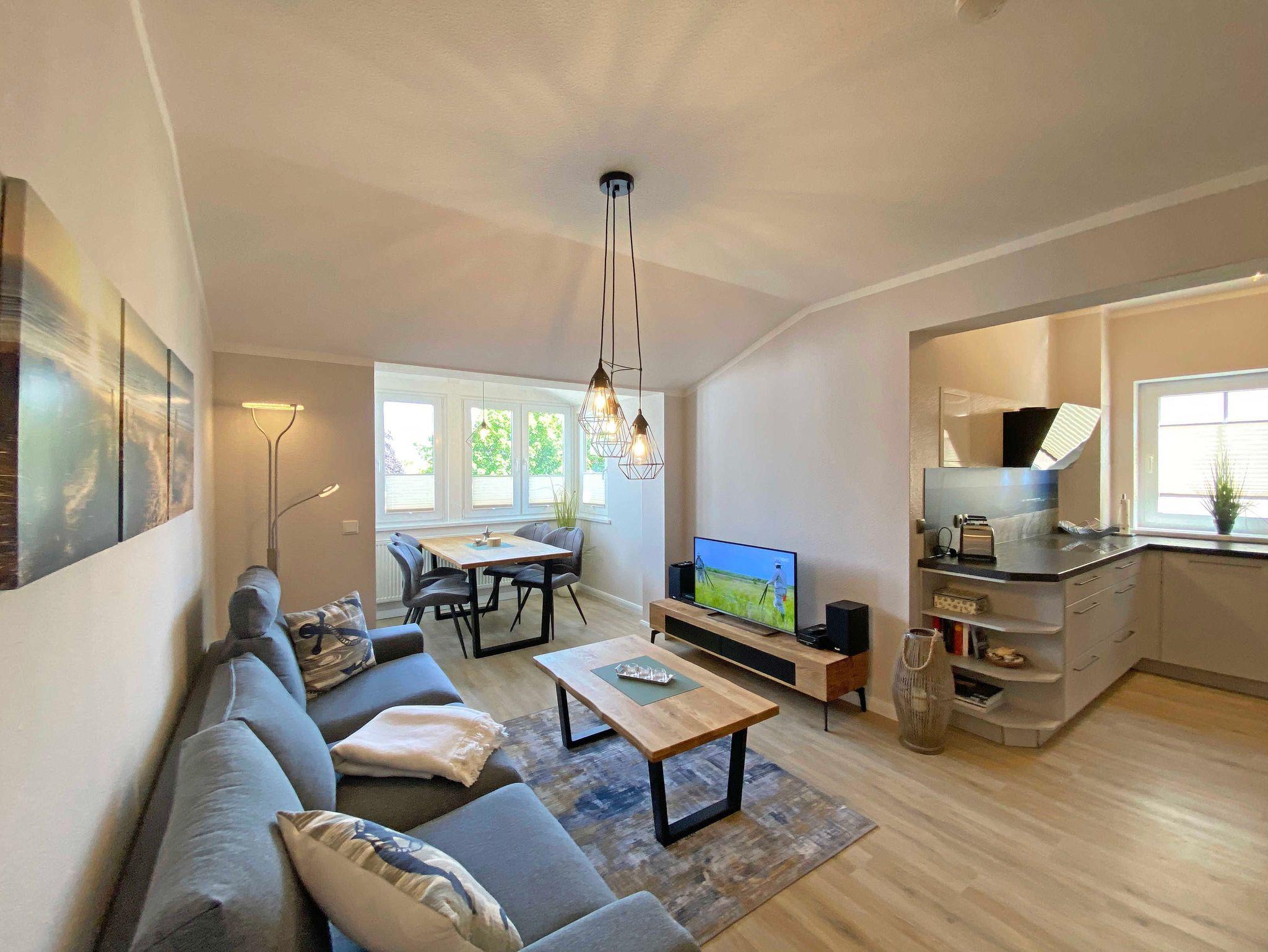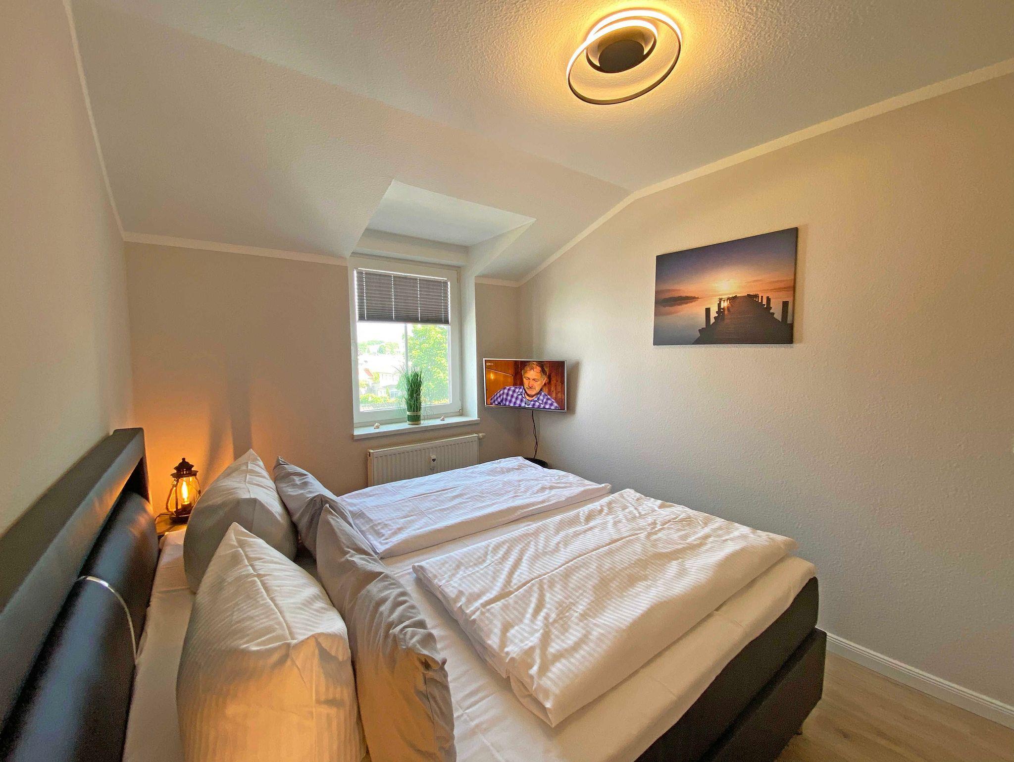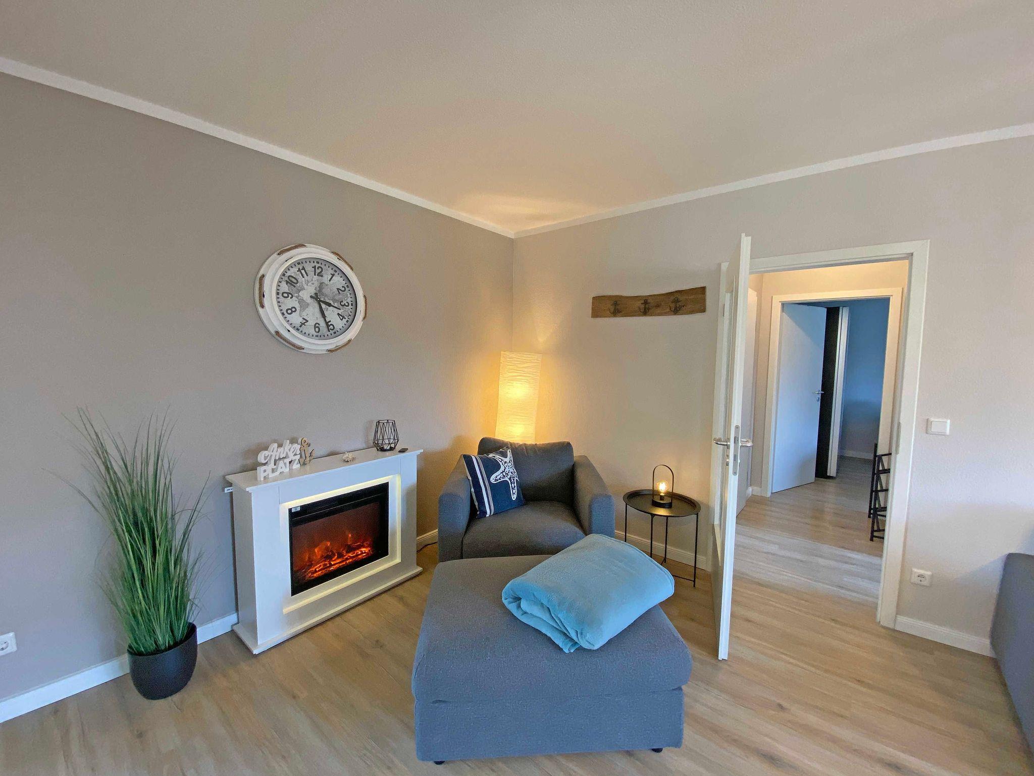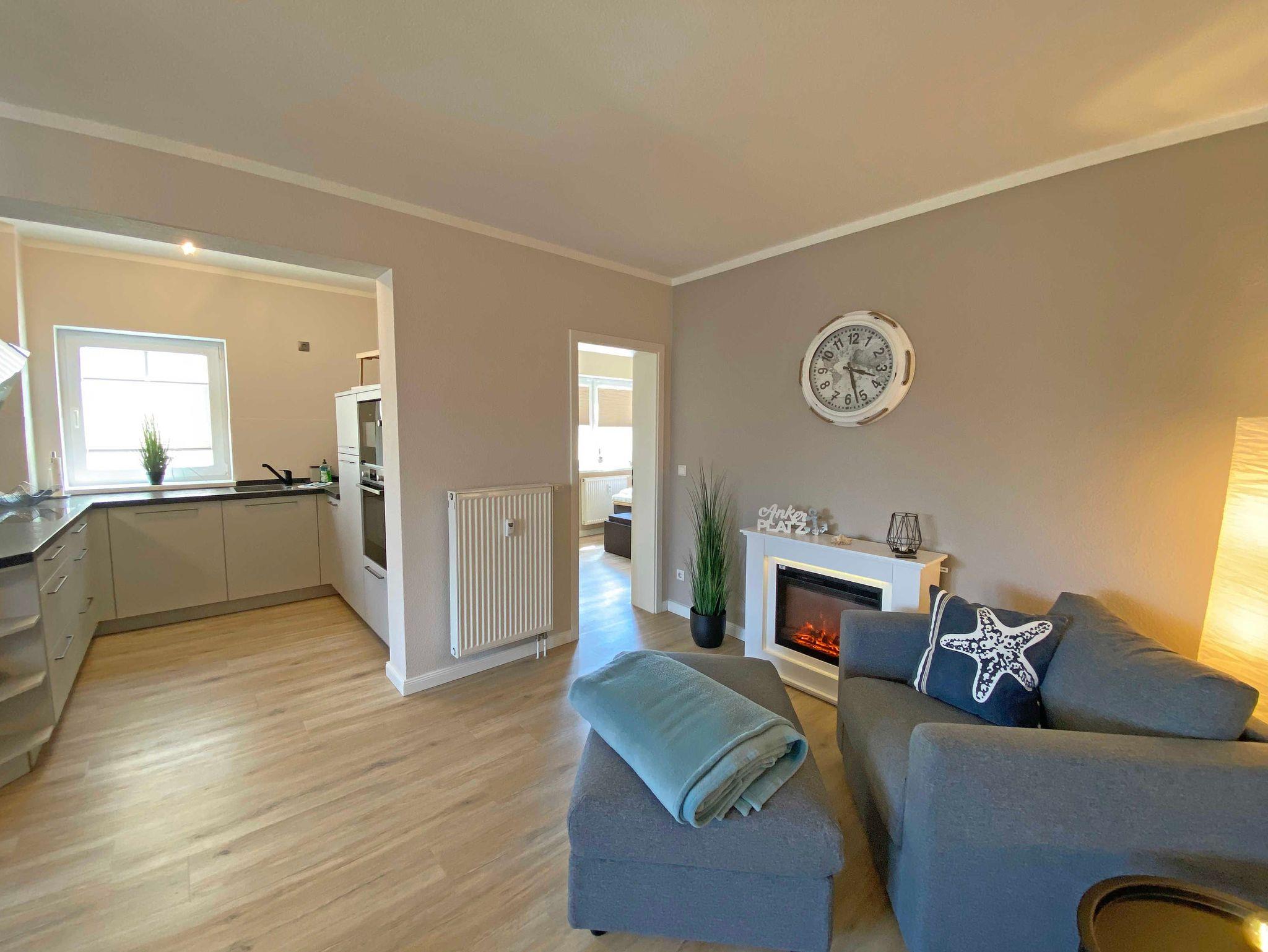 Die komfortabel eingerichtete geräumige Nichtraucherwohnung mit ca. 59 qm verfügt über ein großes Wohnzimmer mit offenem Küchenbereich und einem geschlossenen Balkon/Veranda. Sie bietet ausreichend Platz für 2 bis 4 Erwachsene + 1 Kleinkind bis 3 Jahre im Kinderreisebett und befindet sich im 2. OG. Sie erwartet ein heller und freundlicher Designboden in allen Räumen. Eine gemütliche Kombination mit Couch, Couchtisch, Leselampe, Sessel und Hocker sorgen für individuelle Sitz ? und Relax Möglichkeiten nach einer langen Strandwanderung oder einem Waldspaziergang. Zur komfortablen Ausstattung gehören selbstverständlich ein Lowboard, Smart-TV, ein Blu-Ray Player und eine Teufel-Musikanlage mit Radio, DAB-Radio, CD-Spieler, USB-Anschluss und Bluetooth sowie einen WLAN-Anschluss für die Verbindung zu Ihrem Mobiltelefon, Tablet oder Notebook. Ein Elektrokamin im Wohnbereich lädt dazu ein, die kühleren Abende in wohliger Stimmung bei einem Glas Wein oder Rum ausklingen zu lassen. In der hellen Veranda ist der Essbereich platziert, so dass Sie schon beim Frühstück den herrlichen Blick über die Dächer von Göhren genießen können sowie auf die Ostsee. Angrenzend zum Wohnbereich befindet sich die vollausgestattete Küchenzeile mit Geschirrspüler, Toaster, Wasserkocher, Kaffeemaschine, 4 Zonen-Kochfeld, Backofen, integrierter Mikrowelle, Kühl-Gefrierkombination und hochwertiger Granitarbeitsflächen, welche Ihnen einen ansprechenden Komfort zur unabhängigen Selbstverpflegung bietet. Im größeren Schlafzimmer mit einem Boxspringbett (1,80m x 2,00m), Nachtischablagen, Kleiderschrank und Smart-TV träumen Sie von Wellen, Sand und Natur. Im kleineren Schlafzimmer befindet sich ebenfalls ein Boxspringbett mit durchgehender Matratze (1,60m x 2,00m) und ein Kleiderschrank. Für einen ruhigen Schlaf sorgen Verdunklungsplissees und Vorhänge. Das Tageslicht-Bad verfügt über eine Dusche mit flachem Einstieg, mit WC, einem Fön, einem Kosmetikspiegel und einen Waschtisch. Eine liebevolle Einrichtung im maritimen Stil rundet das Erscheinungsbild des Ferienapartments ab. Ein Haustier kann gegen eine Gebühr dazu gebucht werden. Im Keller des Hauses können Sie eine Waschmaschine sowie ein Trockner gegen Gebühr nutzen. Natürlich steht Ihnen ein separater Parkplatz (Nr.08) auf dem Hof des Grundstückes zur Verfügung. Ausreichend Abstellmöglichkeiten in einem separaten abschließbaren Raum neben dem Parkplatz für E-Bikes, Fahrräder, Surfbrett etc. sind vorhanden. Die Erstausstattung eines Wäschepaketes (komplette Bettwäsche, 1 Duschhandtuch, 2 kleine Handtücher) können Sie bis 14 Tage vor Anreise gegen einen Aufpreis dazu buchen oder durch eigene ergänzen. Ab 2 gebuchten Paketen erhalten Sie einmalig 1 Geschirrhandtuch und 1 Duschvorleger hinzu.