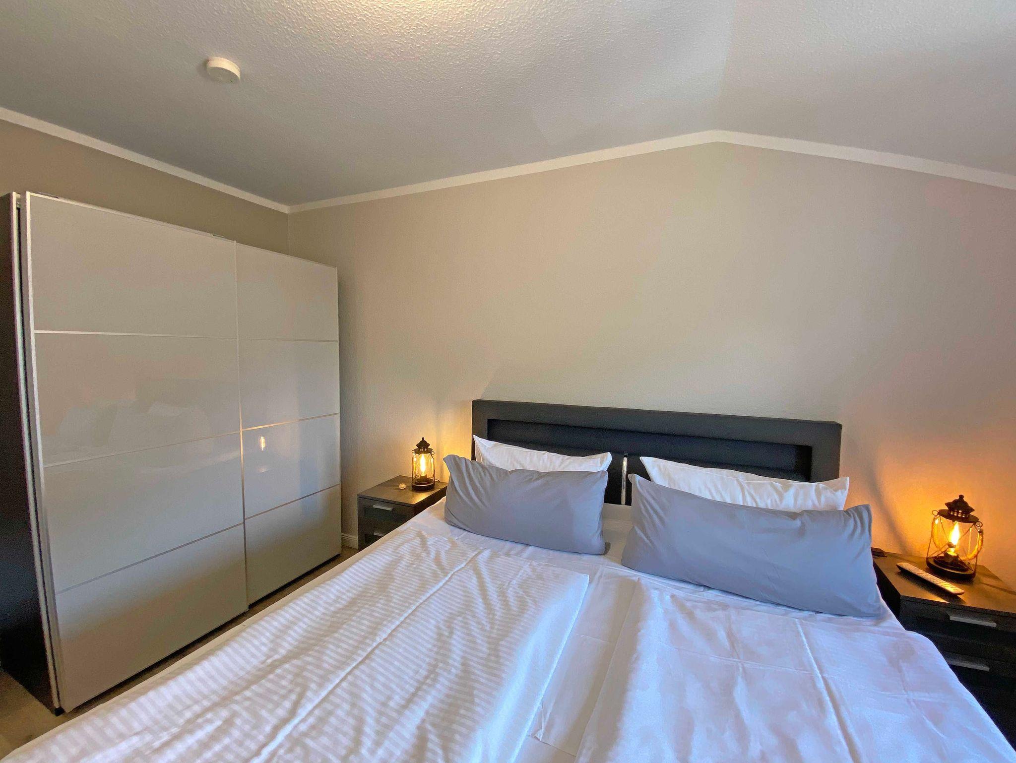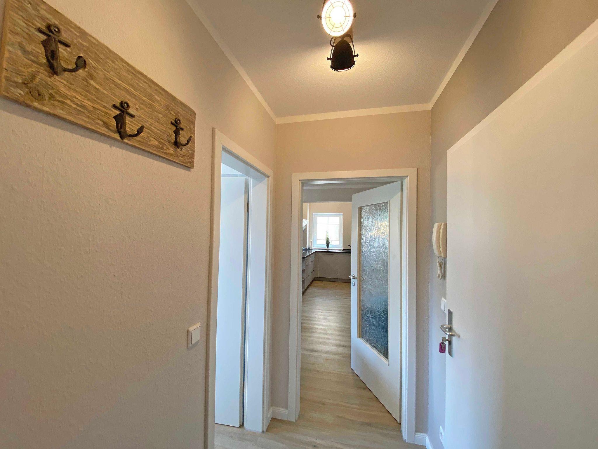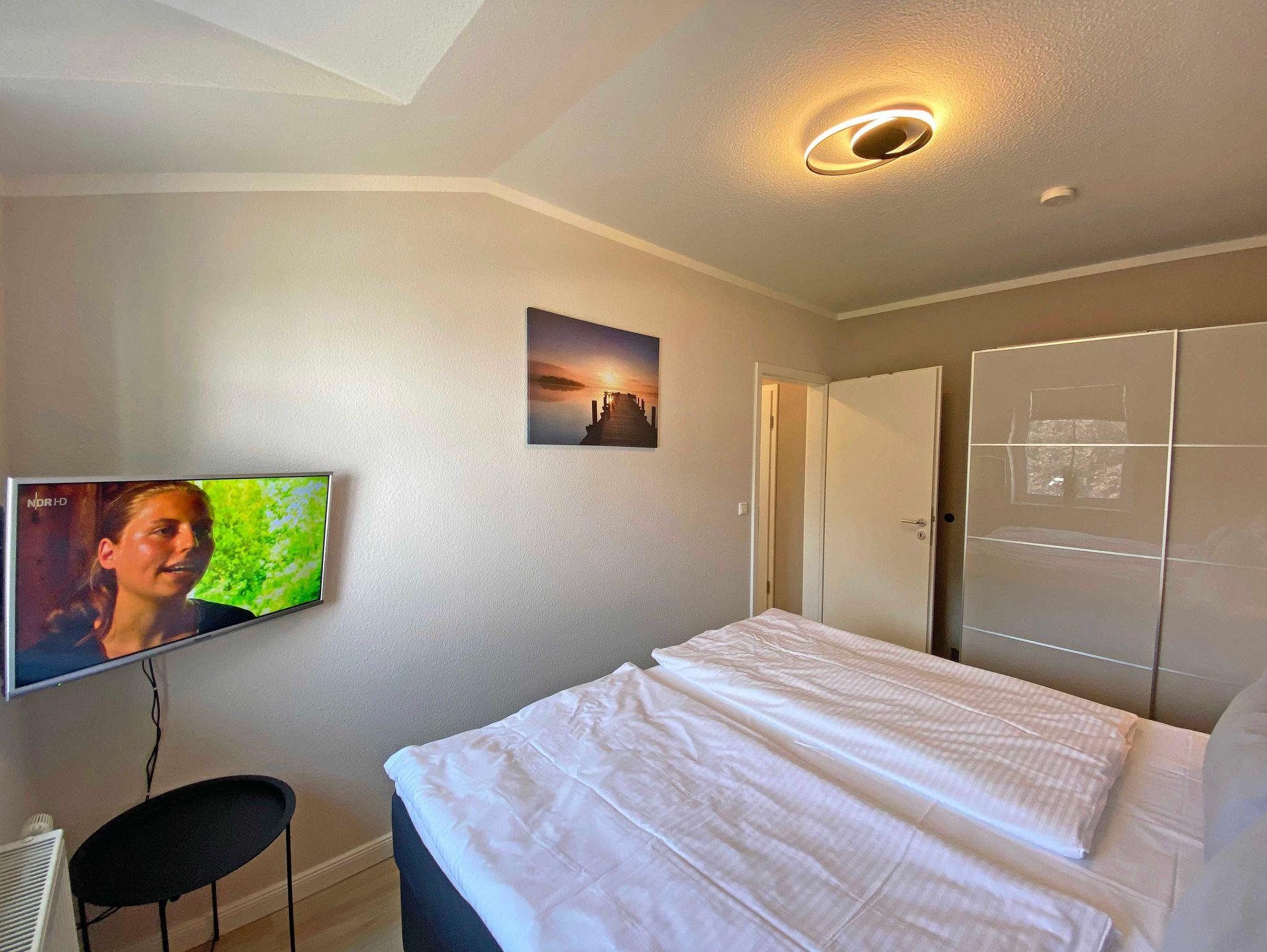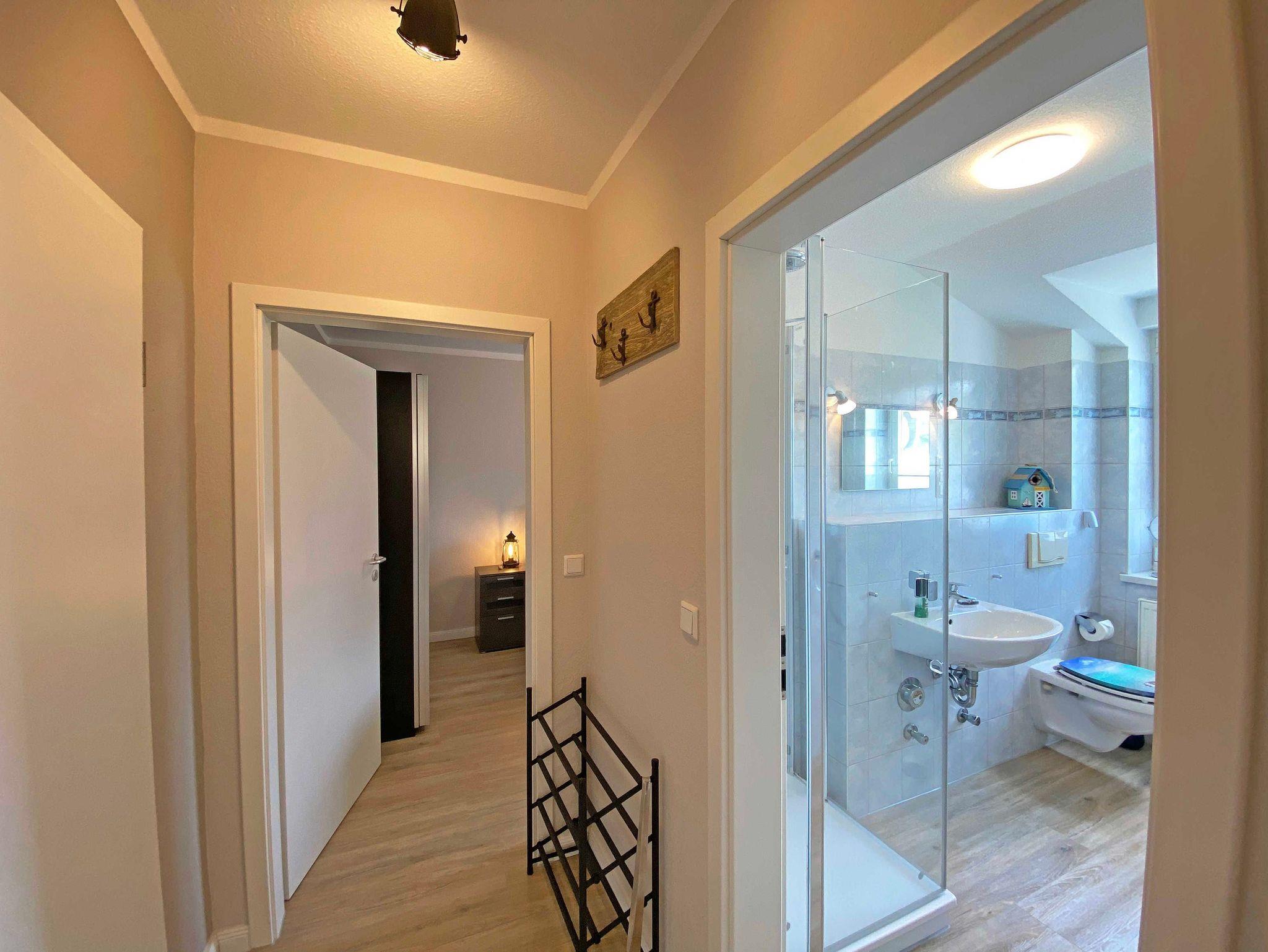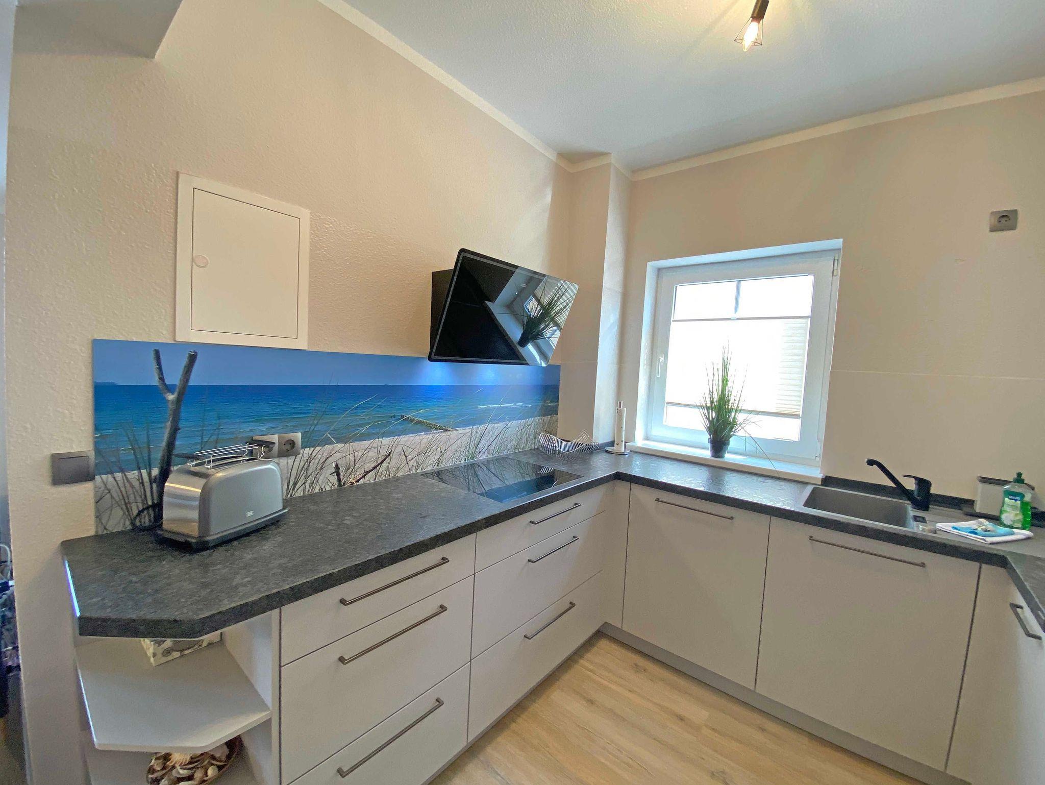 Die komfortabel eingerichtete geräumige Nichtraucherwohnung mit ca. 59 qm verfügt über ein großes Wohnzimmer mit offenem Küchenbereich und einem geschlossenen Balkon/Veranda. Sie bietet ausreichend Platz für 2 bis 4 Erwachsene + 1 Kleinkind bis 3 Jahre im Kinderreisebett und befindet sich im 2. OG. Sie erwartet ein heller und freundlicher Designboden in allen Räumen. Eine gemütliche Kombination mit Couch, Couchtisch, Leselampe, Sessel und Hocker sorgen für individuelle Sitz ? und Relax Möglichkeiten nach einer langen Strandwanderung oder einem Waldspaziergang. Zur komfortablen Ausstattung gehören selbstverständlich ein Lowboard, Smart-TV, ein Blu-Ray Player und eine Teufel-Musikanlage mit Radio, DAB-Radio, CD-Spieler, USB-Anschluss und Bluetooth sowie einen WLAN-Anschluss für die Verbindung zu Ihrem Mobiltelefon, Tablet oder Notebook. Ein Elektrokamin im Wohnbereich lädt dazu ein, die kühleren Abende in wohliger Stimmung bei einem Glas Wein oder Rum ausklingen zu lassen. In der hellen Veranda ist der Essbereich platziert, so dass Sie schon beim Frühstück den herrlichen Blick über die Dächer von Göhren genießen können sowie auf die Ostsee. Angrenzend zum Wohnbereich befindet sich die vollausgestattete Küchenzeile mit Geschirrspüler, Toaster, Wasserkocher, Kaffeemaschine, 4 Zonen-Kochfeld, Backofen, integrierter Mikrowelle, Kühl-Gefrierkombination und hochwertiger Granitarbeitsflächen, welche Ihnen einen ansprechenden Komfort zur unabhängigen Selbstverpflegung bietet. Im größeren Schlafzimmer mit einem Boxspringbett (1,80m x 2,00m), Nachtischablagen, Kleiderschrank und Smart-TV träumen Sie von Wellen, Sand und Natur. Im kleineren Schlafzimmer befindet sich ebenfalls ein Boxspringbett mit durchgehender Matratze (1,60m x 2,00m) und ein Kleiderschrank. Für einen ruhigen Schlaf sorgen Verdunklungsplissees und Vorhänge. Das Tageslicht-Bad verfügt über eine Dusche mit flachem Einstieg, mit WC, einem Fön, einem Kosmetikspiegel und einen Waschtisch. Eine liebevolle Einrichtung im maritimen Stil rundet das Erscheinungsbild des Ferienapartments ab. Ein Haustier kann gegen eine Gebühr dazu gebucht werden. Im Keller des Hauses können Sie eine Waschmaschine sowie ein Trockner gegen Gebühr nutzen. Natürlich steht Ihnen ein separater Parkplatz (Nr.08) auf dem Hof des Grundstückes zur Verfügung. Ausreichend Abstellmöglichkeiten in einem separaten abschließbaren Raum neben dem Parkplatz für E-Bikes, Fahrräder, Surfbrett etc. sind vorhanden. Die Erstausstattung eines Wäschepaketes (komplette Bettwäsche, 1 Duschhandtuch, 2 kleine Handtücher) können Sie bis 14 Tage vor Anreise gegen einen Aufpreis dazu buchen oder durch eigene ergänzen. Ab 2 gebuchten Paketen erhalten Sie einmalig 1 Geschirrhandtuch und 1 Duschvorleger hinzu.
