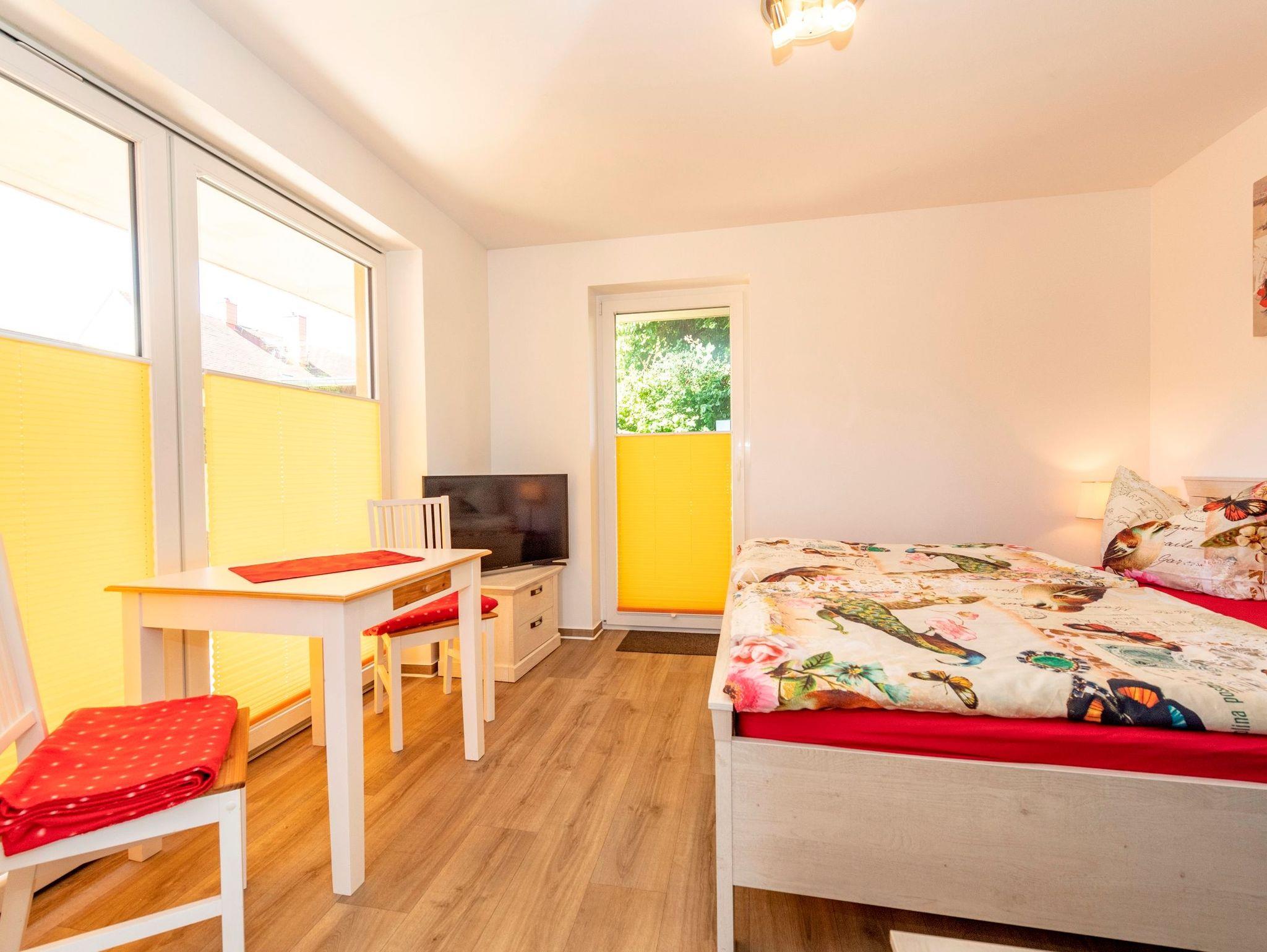 Unsere ruhig gelegenen, hellen und lichtdurchfluteten 1-Raum-Ferienwohnungen mit Terrasse sind wie folgt ausgestattet: