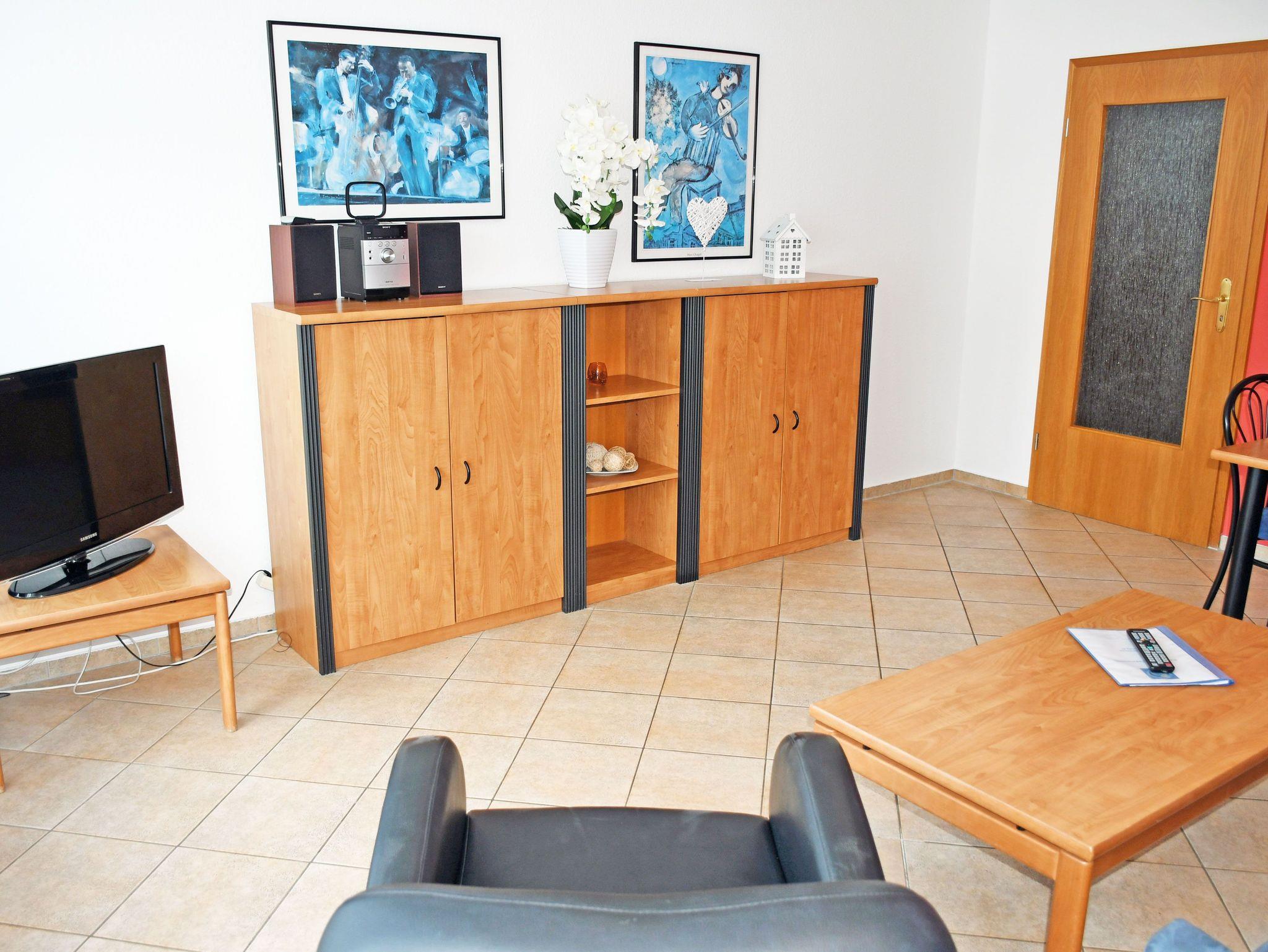 * Wohnbereich mit ausziehbarer, moderner Doppelbettschlafcouch (150 x 200 cm), 2 Sesseln, Couchtisch, Anrichte, Flat-TV, CD-Radio-Anlage und Esstisch mit 4 Stühlen