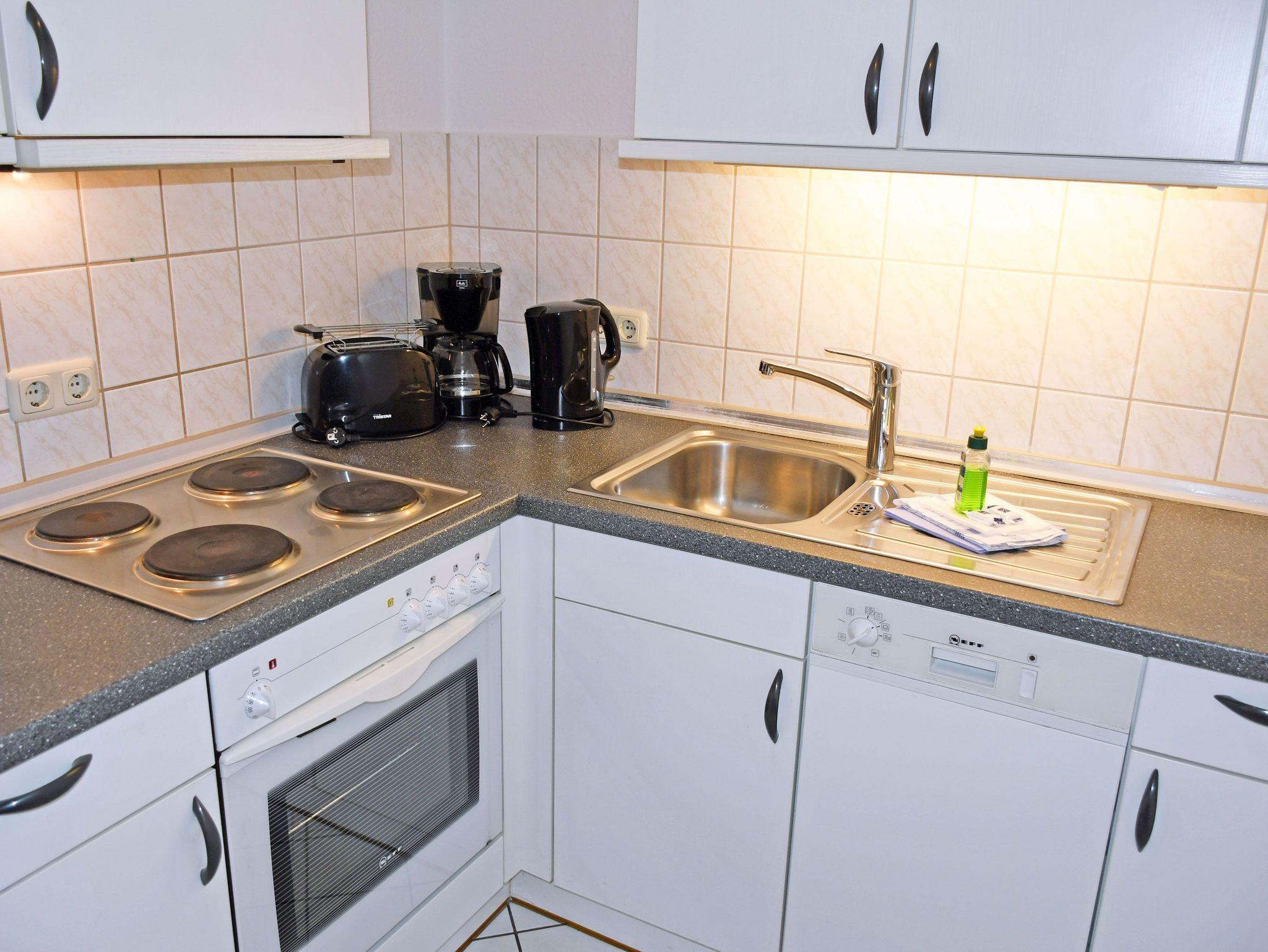 * separate Küche, ausgestattet mit: 4-Platten-Kochfeld, Backofen, Dunstabzugshaube, großer Kühlschrank mit Gefrierfach, Geschirrspüler, Toaster, Kaffeemaschine, Wasserkocher und Küchenutensilien