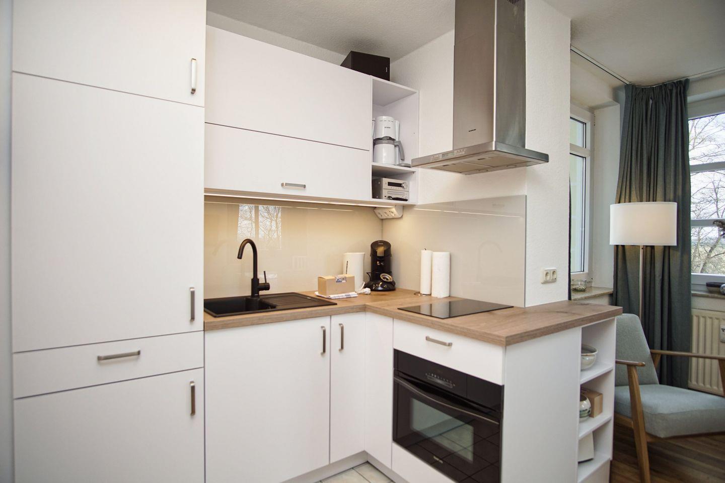 KÜCHE // Küchenzeile, 4-Platten-Herd, Spülmaschine, Kühlschrank mit Gefrierfach, Backofen, Mikrowelle, Toaster, Wasserkocher, Kaffeemaschine, reichlich Besteck, Geschirr und Küchenutensilien ++