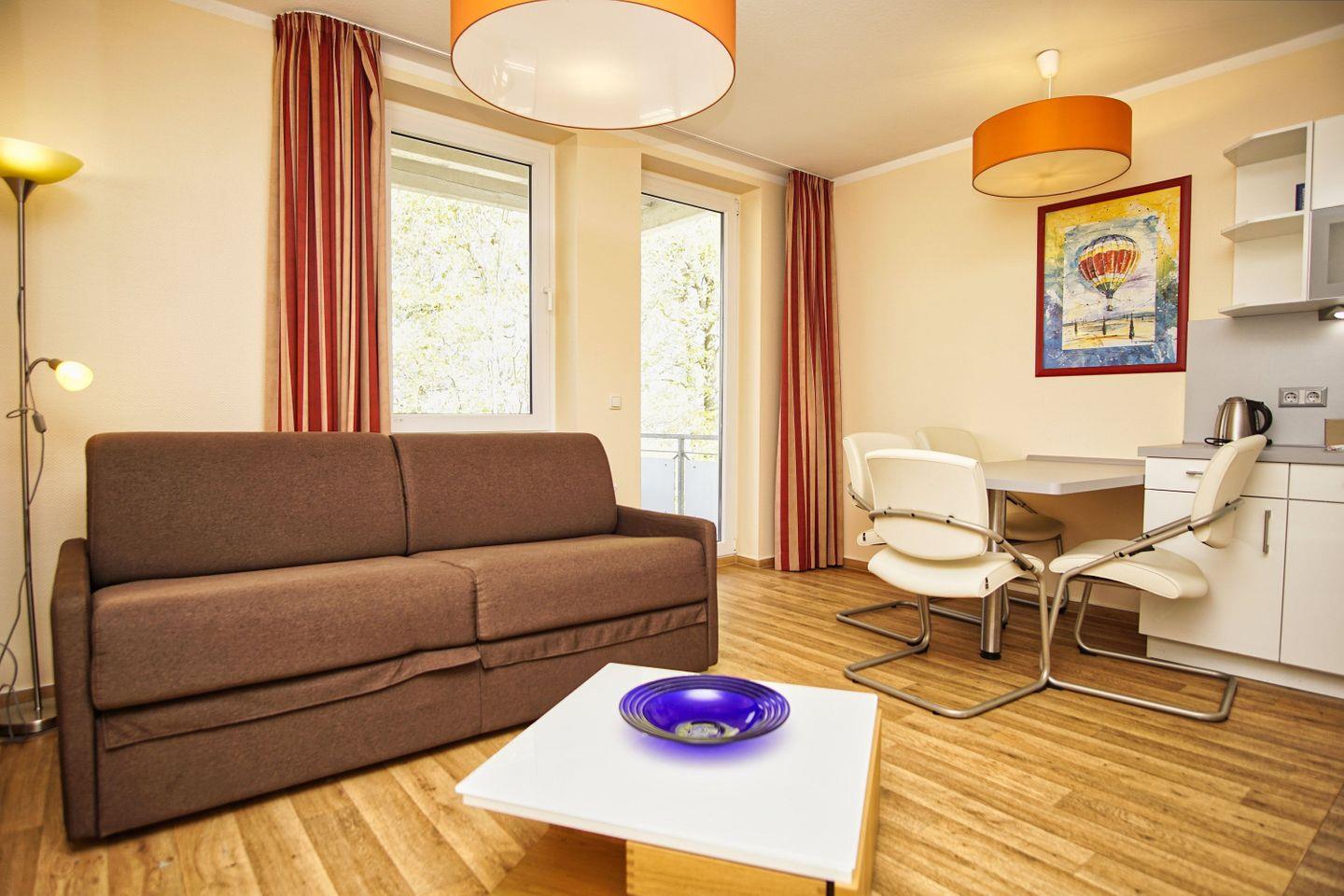 WOHNEN // Wohnraum mit Essbereich, Sitzgarnitur mit bequemer Schlafcouch, Kabel-TV ++