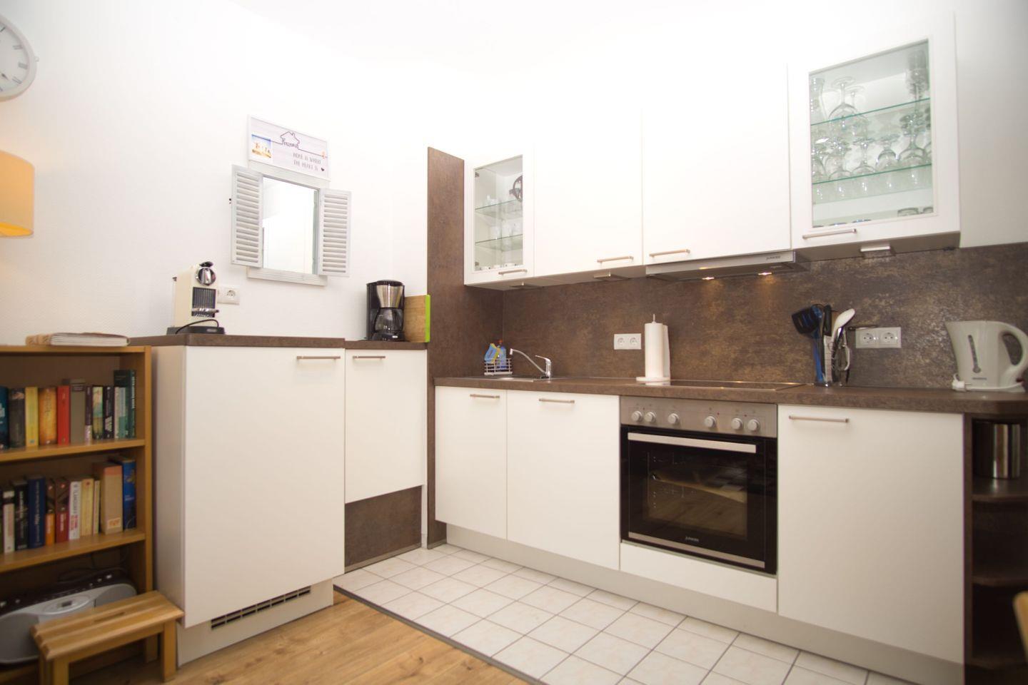 KÜCHE // Küchenzeile, 4-Platten Herd, Spülmaschine, Kühlschrank mit Gefrierfach, Backofen, Toaster, Wasserkocher, Kaffeemaschine, reichlich Besteck, Geschirr und Küchenutensilien ++