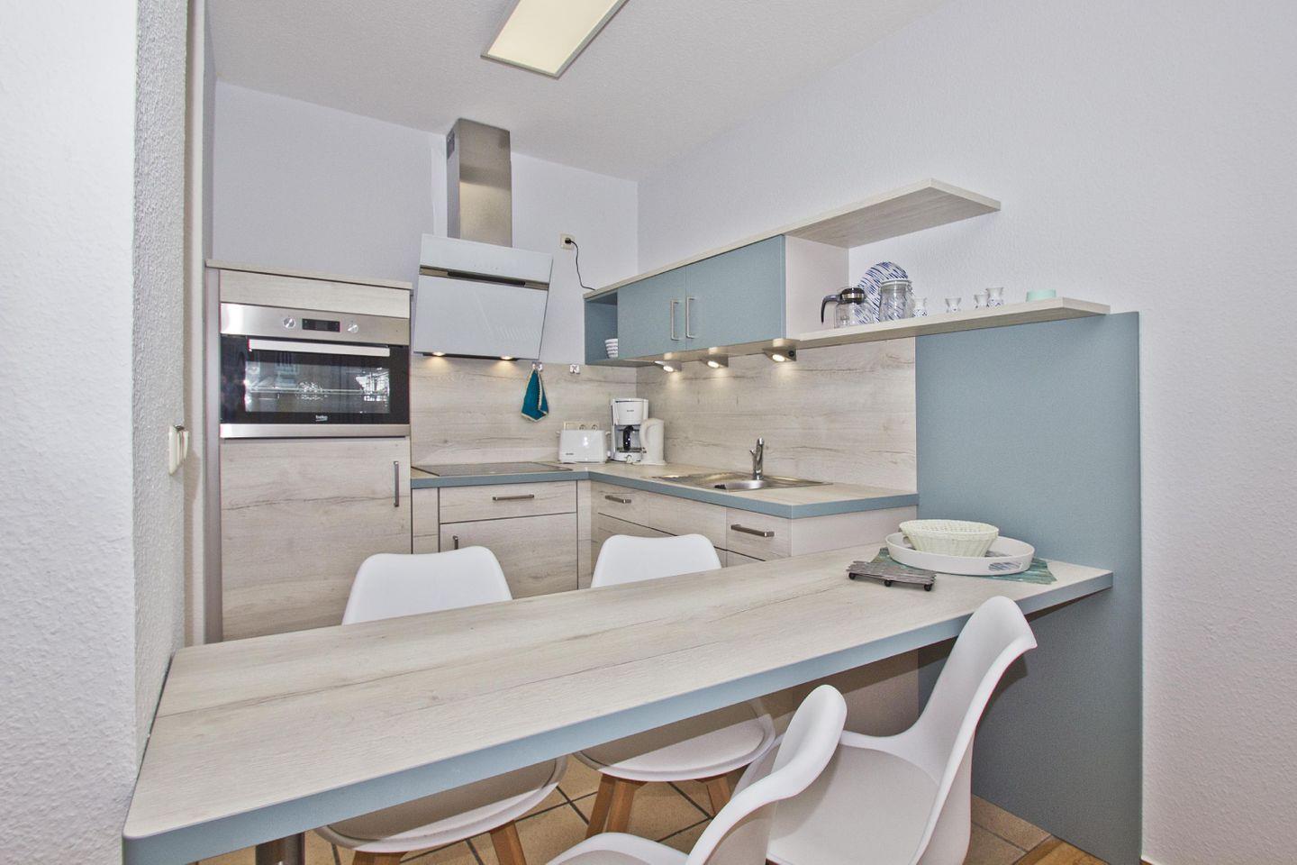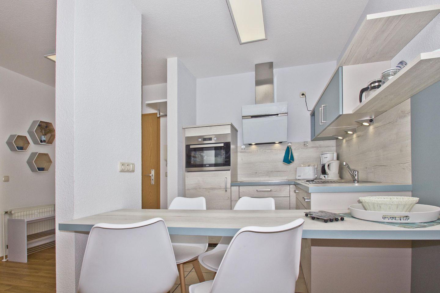 KÜCHE // offene Küche, 4-Platten Herd, Spülmaschine, Kühlschrank mit Gefrierfach, Backofen, Toaster, Wasserkocher, Kaffeemaschine, reichlich Besteck, Geschirr und Küchenutensilien ++