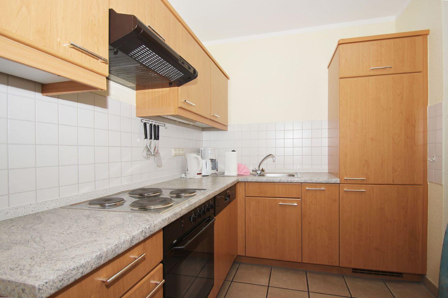 KÜCHE // offene Küche, 4-Platten Herd, Spülmaschine, Kühlschrank mit Gefrierfach, Backofen, Toaster, Wasserkocher, Kaffeemaschine, reichlich Besteck, Geschirr und Küchenutensilien ++