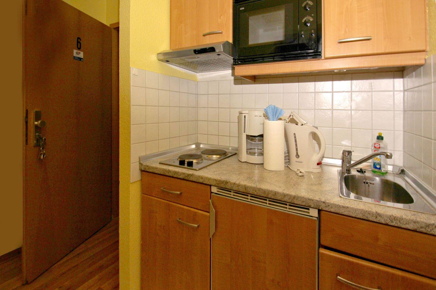 KÜCHE // offene Küche, 2-Platten Herd, Kühlschrank mit Gefrierfach, Mikrowelle, Toaster, Wasserkocher, Kaffeemaschine, reichlich Besteck, Geschirr und Küchenutensilien ++