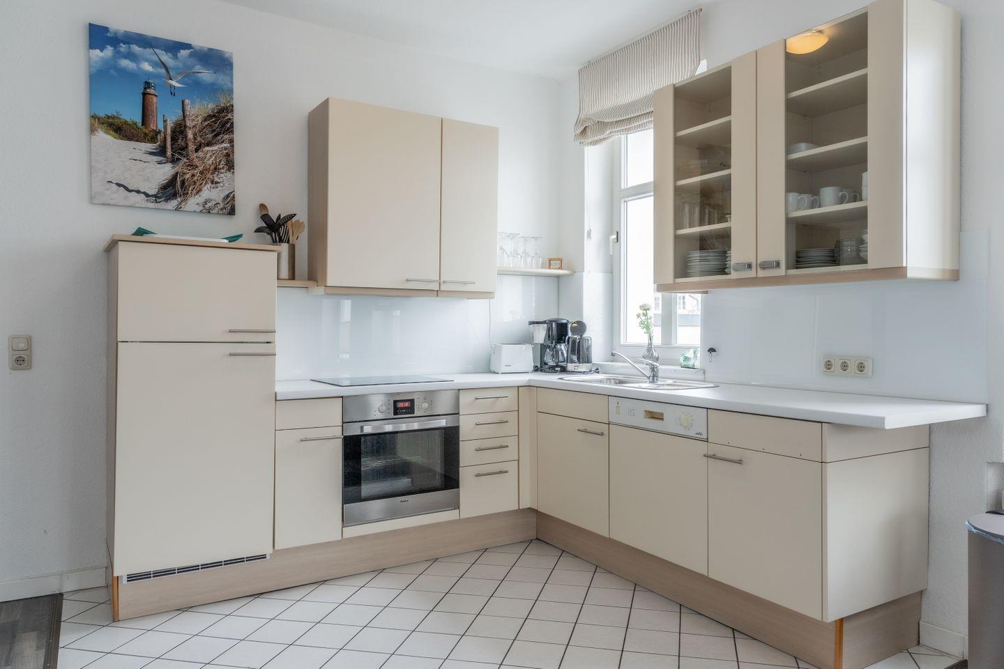 KÜCHE // Küchenzeile, 4-Platten-Herd, Spülmaschine, Kühlschrank mit Gefrierfach, Backofen, Toaster, Wasserkocher, Kaffeemaschine, reichlich Besteck, Geschirr und Küchenutensilien ++