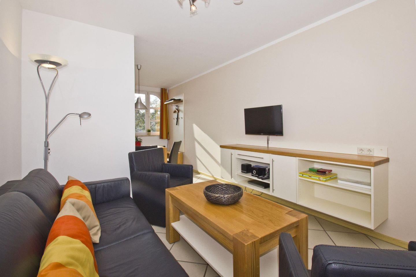WOHNEN // Wohnraum mit Essbereich, Esstisch mit 4 Stühlen, Sitzgarnitur, Couch mit Schlaffunktion, Kabel-TV, Radio, CD-Player ++