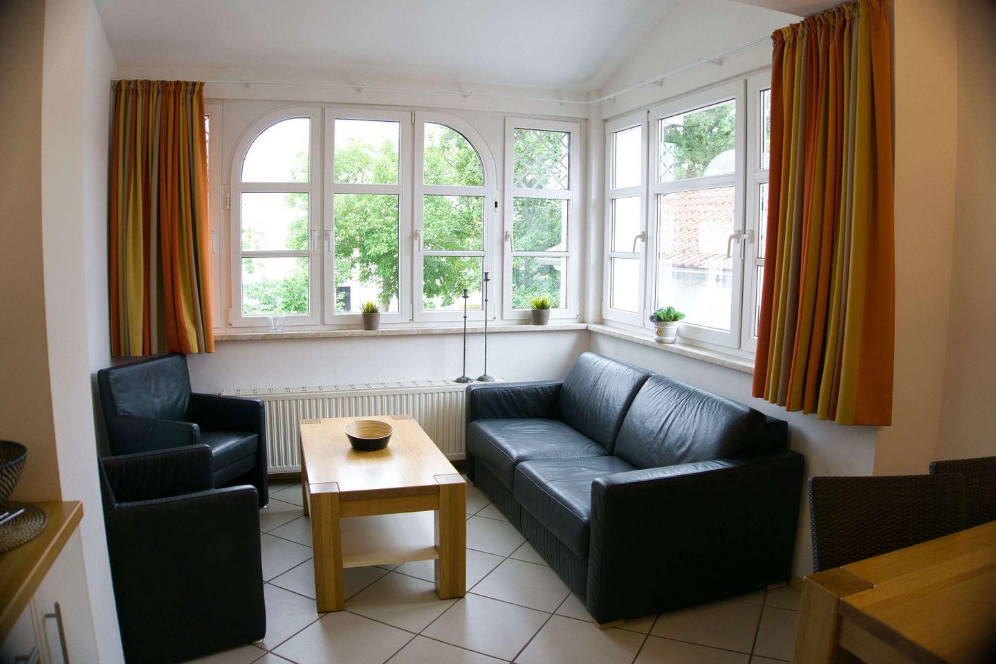 WOHNEN // Wohnraum mit Essbereich, Esstisch mit 4 Stühlen, Sitzgarnitur, Couch mit Schlaffunktion, Kabel-TV, Radio, CD-Player ++