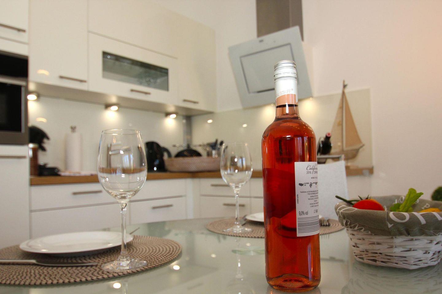 KÜCHE // offene Küche, 4-Felder Ceranherd, Kombigerät (Backofen und Mikrowelle), Kühlschrank mit Gefrierfach, Geschirrspüler, Toaster, Wasserkocher, Kaffeemaschine, Senseo Kaffeepadmaschine, reichlich Besteck, Geschirr und Küchenutensilien ++