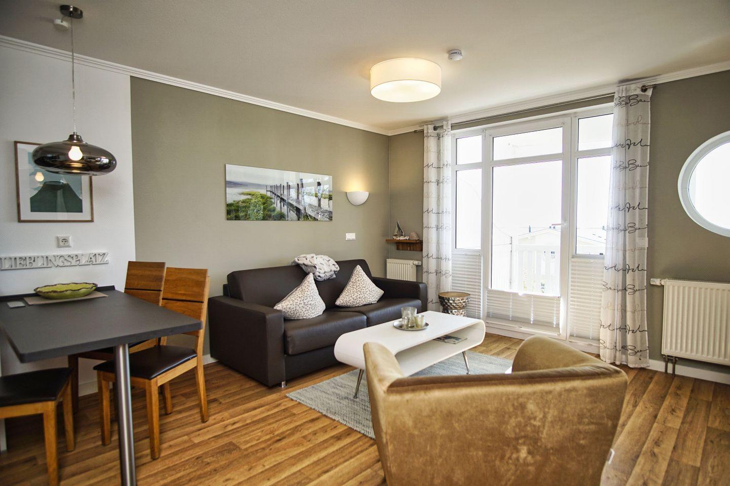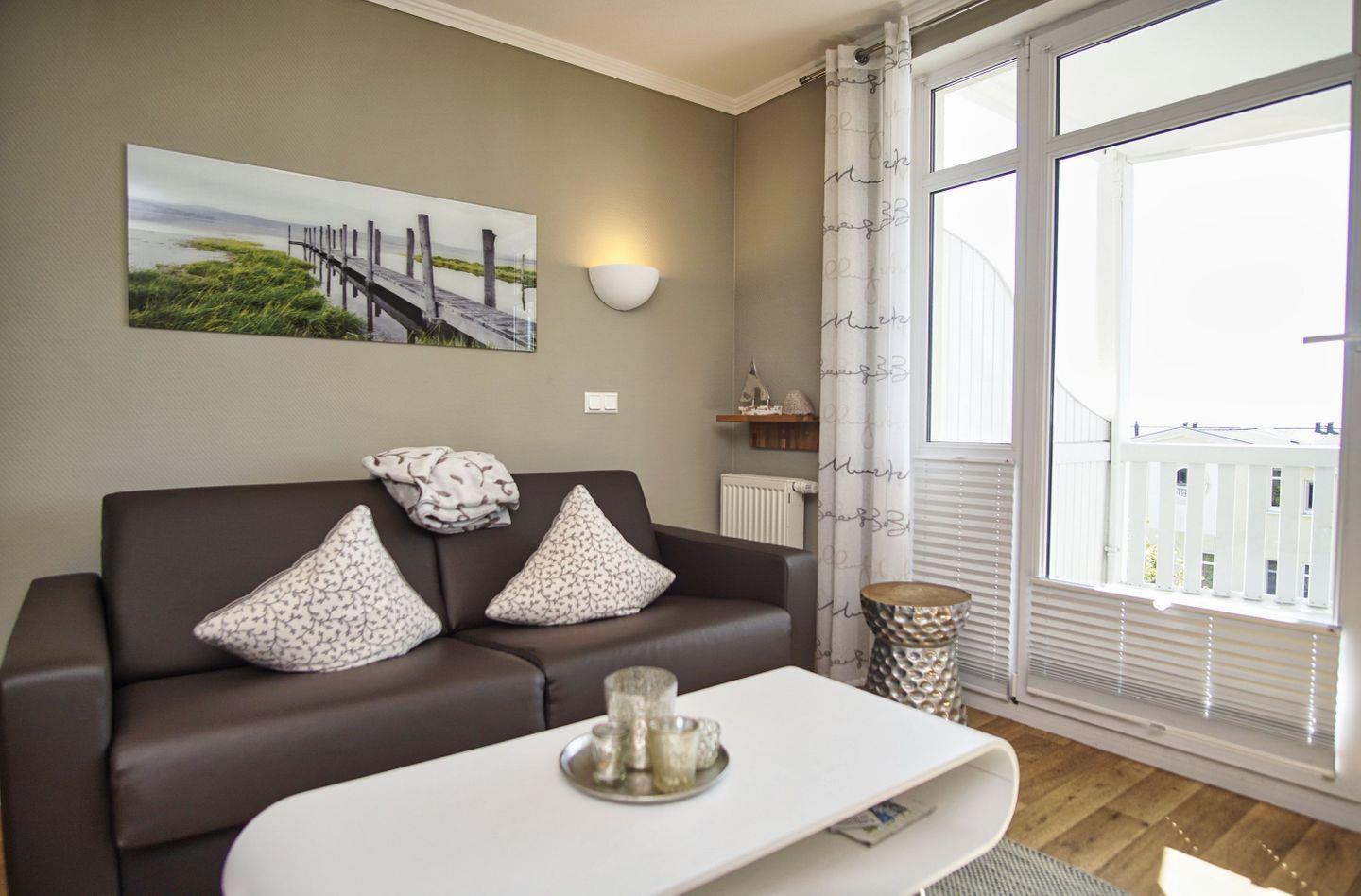 Moderne 2-Raum-Ferienwohnung in Göhren mit Balkon und herrlichem Meerblick, inklusive kostenlosem WLAN, Parkplatz und Zugang zum Erlebnisbad.