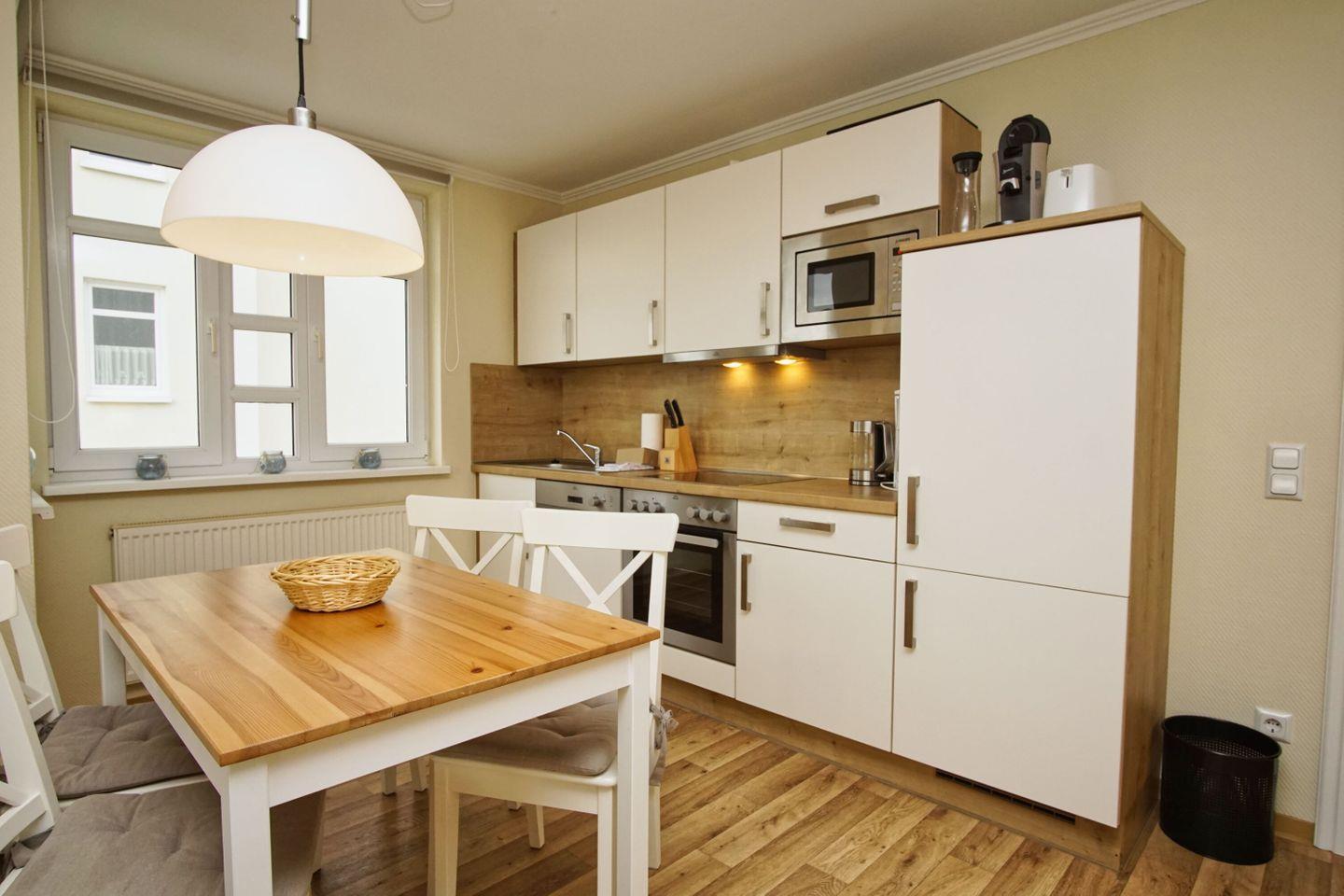 KÜCHE // Küchenzeile, 4-Platten-Herd, Spülmaschine, Kühlschrank mit Gefrierfach, Backofen, Mikrowelle, Toaster, Wasserkocher, Kaffeemaschine, reichlich Besteck, Geschirr und Küchenutensilien ++