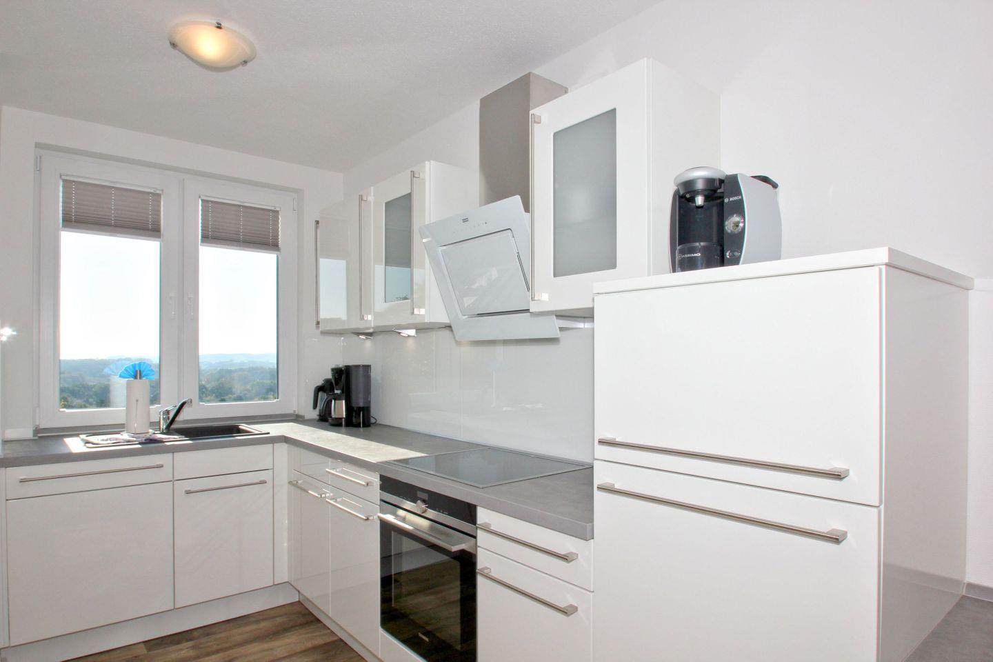 KÜCHE // Küchenzeile, Ceranherd, Spülmaschine, Kühlschrank mit Gefrierfach, Backofen, Toaster, Wasserkocher, Kaffeemaschine, reichlich Besteck, Geschirr und Küchenutensilien ++
