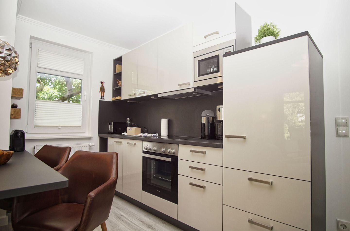 KÜCHE // Küchenzeile, 4-Platten Herd, Spülmaschine, Kühlschrank mit Gefrierfach, Backofen, Toaster, Wasserkocher, Kaffeemaschine, reichlich Besteck, Geschirr und Küchenutensilien ++