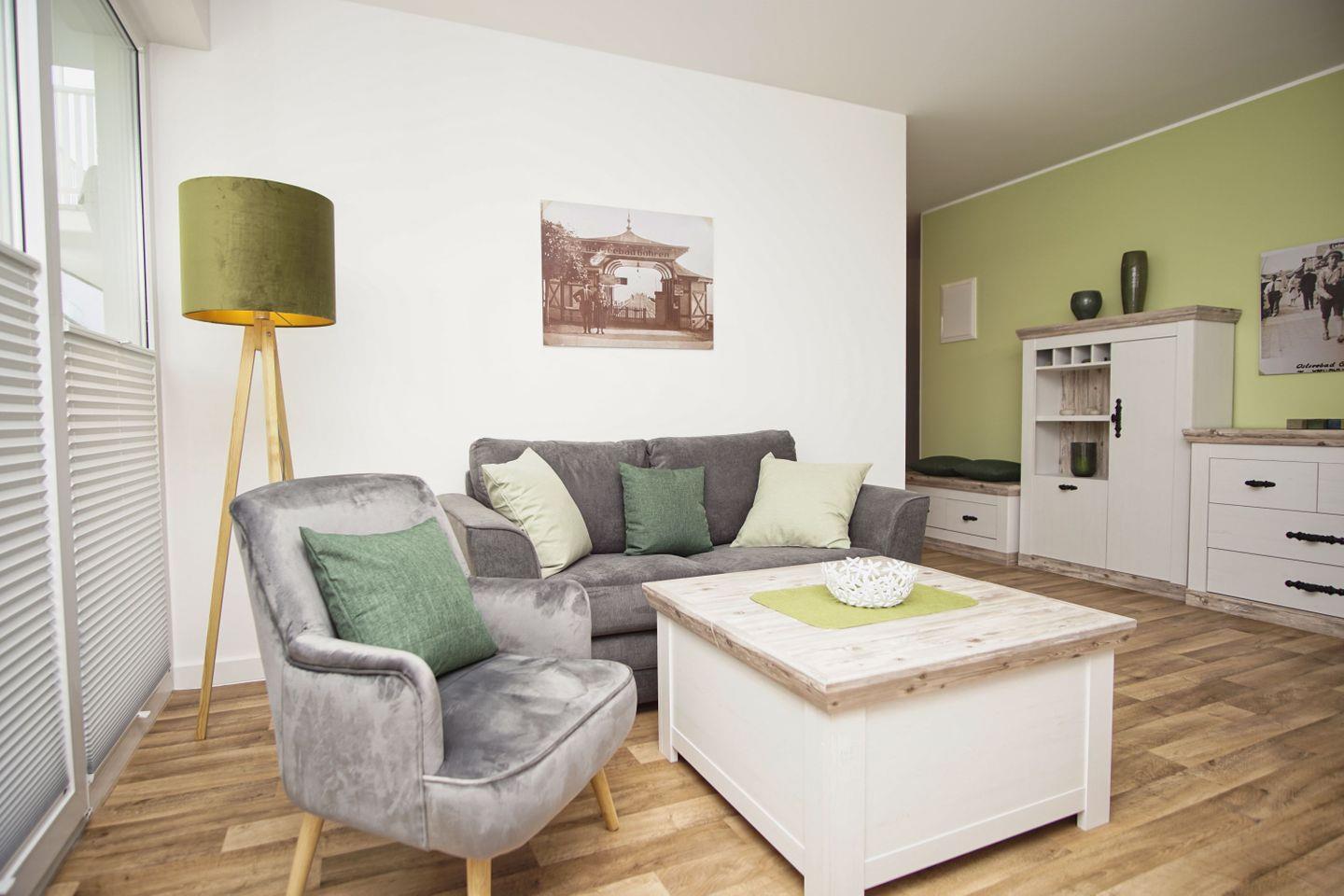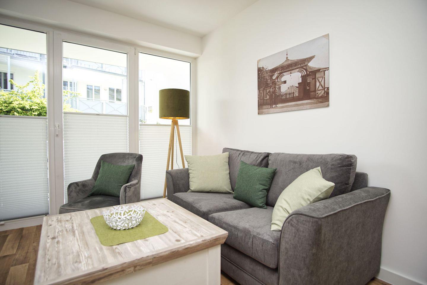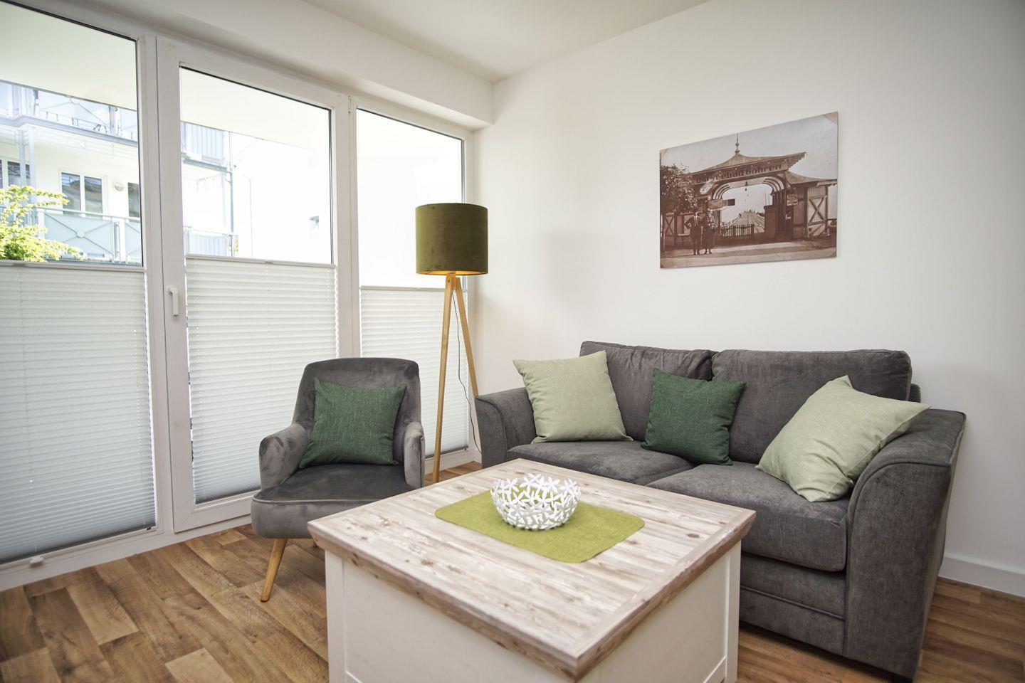 Gemütliche 2-Raum-Ferienwohnung in der Villa Karola mit Terrasse nahe Sandstrand und kostenfreiem Erlebnisbadzugang.