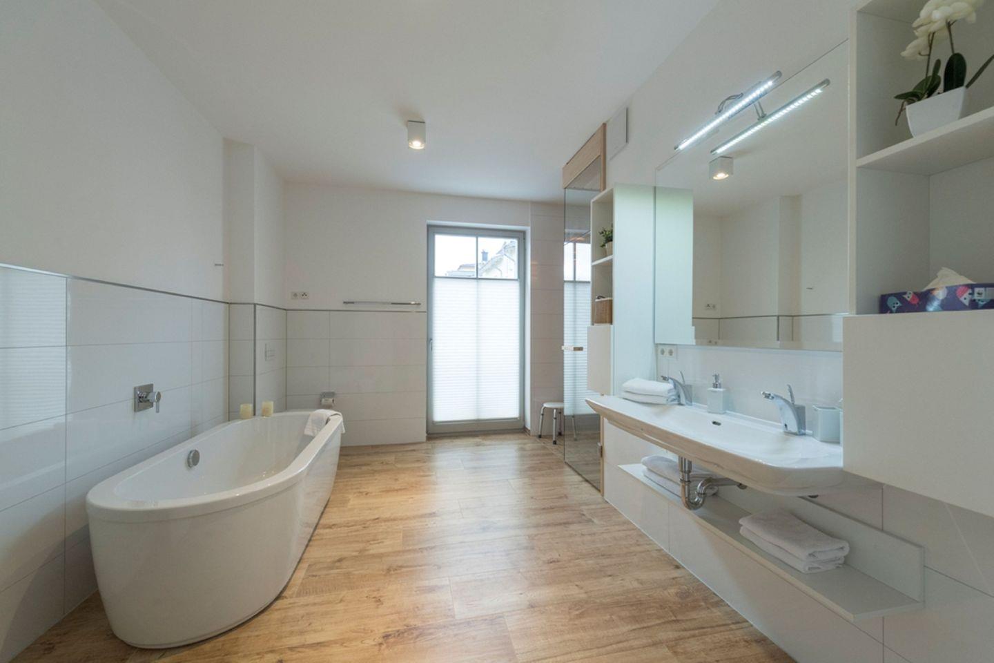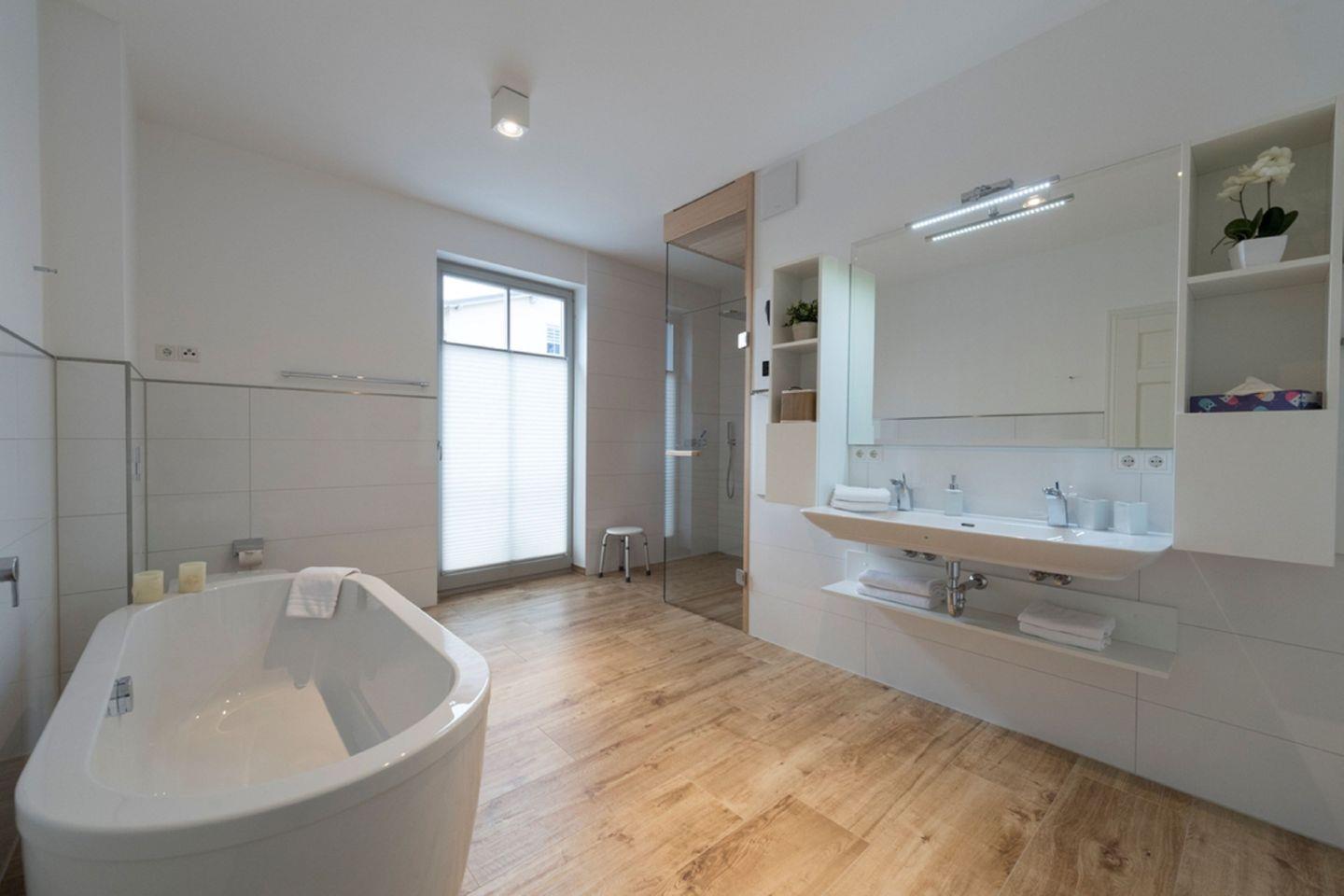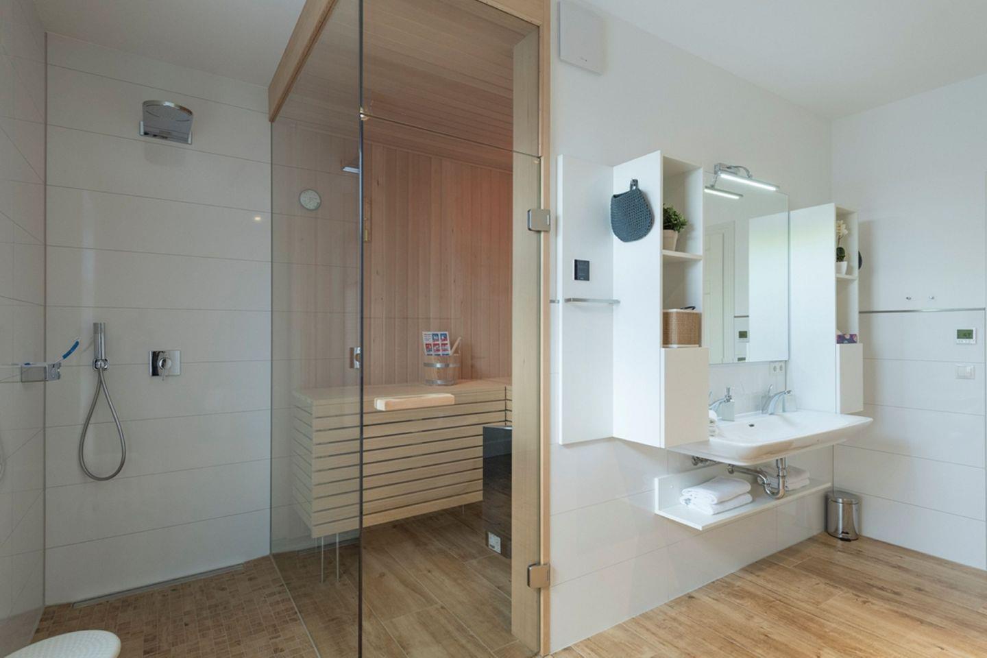 BAD // ein Badezimmer mit Badewanne und WC, Regendusche und eigener Sauna, Hocker, Fön, zweites Badezimmer mit Regendusche und WC ++