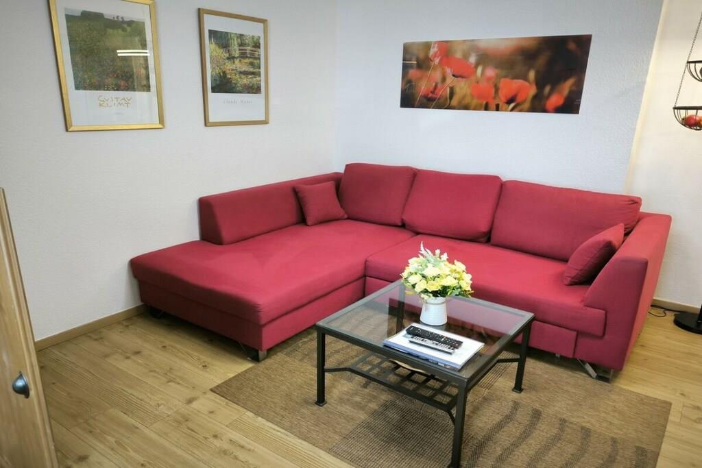 2-Raum-Ferienwohnung im EG. für max. 4 Personen. Eingangsbereich. 1 Wohnzimmer mit ausziehbarer Schlafcouch für zwei Personen, 1 kleiner Couchtisch, Anrichte, TV-Schrank mit Fernseher, DVD-Player und Radio/CD-Anlage, 1 Esstisch mit 4 Stühlen. Vom Wohnbereich abgegrenzte Einbauküche, ausgestattet mit 4-Platten-Ceran-Kochfeld und Backofen, Dunstabzugshaube, großem Kühlschrank mit Gefrierfach, Spüle, Spülmaschine, Mikrowelle, Toaster, Kaffeemaschine, Wasserkocher, Eierkocher, Mixer und diversen Küchenutensilien. 1 Schlafzimmer mit Rattanbett (180 x 200 cm) und großem Kleiderschrank, Schuhkommode, Standspiegel sowie Kommode mit Schubladen und ausklappbarem Wickeltisch und Weckradio. 1 Bad mit Dusche, WC und Fön. Kostenloses W-LAN.
