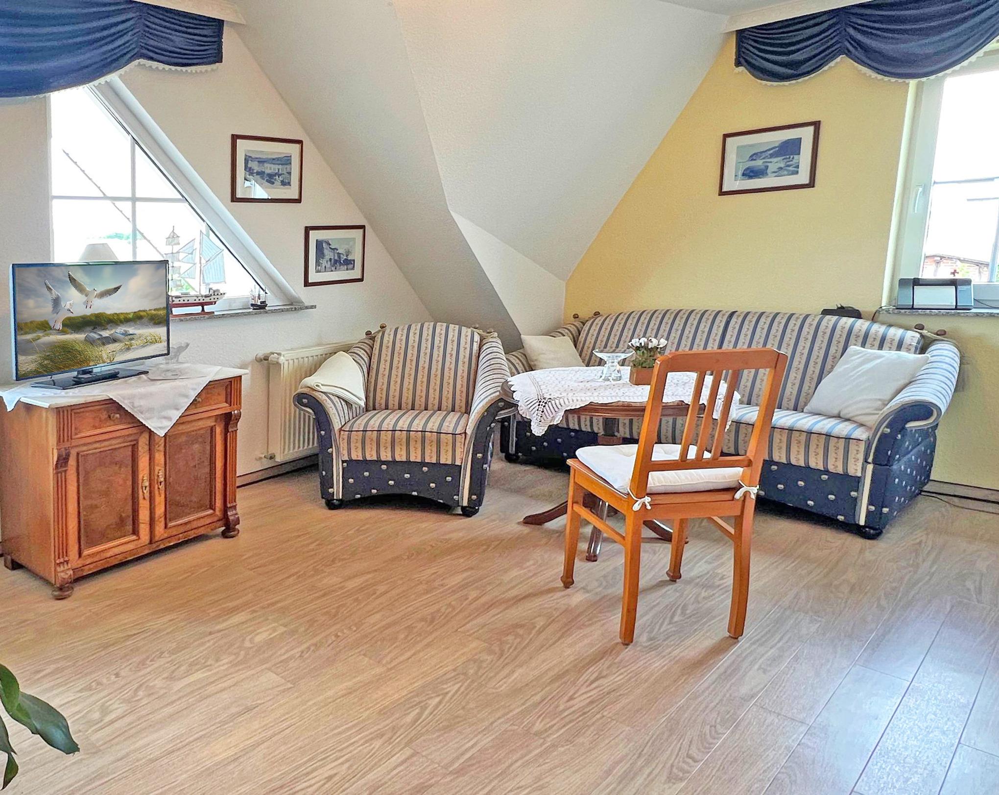 Die haustierfreie 36m²-Wohnung Nr. 1 liegt im Dachgeschoss und besteht aus einem Wohnraum mit Flachbild-TV, Küchenzeile (Kaffeemaschine, Wasserkocher, Toaster, Eierkocher, Kühlschrank, Mikrowelle, E-Herd), einem Bad mit Dusche/WC, Haartrockner, einem separaten Schlafraum mit einem Doppelbett. Es erwartet Sie ein großer West-Balkon mit Nachmittag- und Abendsonne.