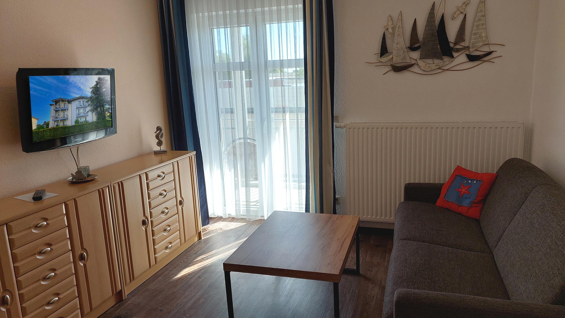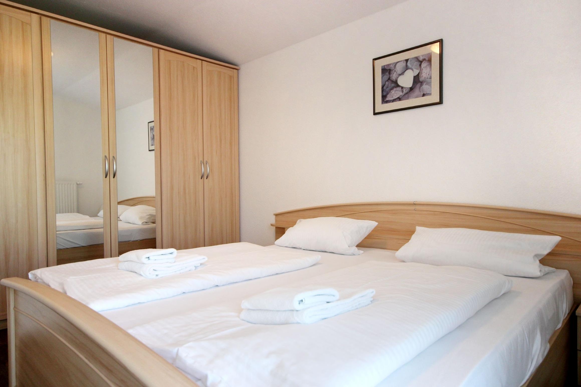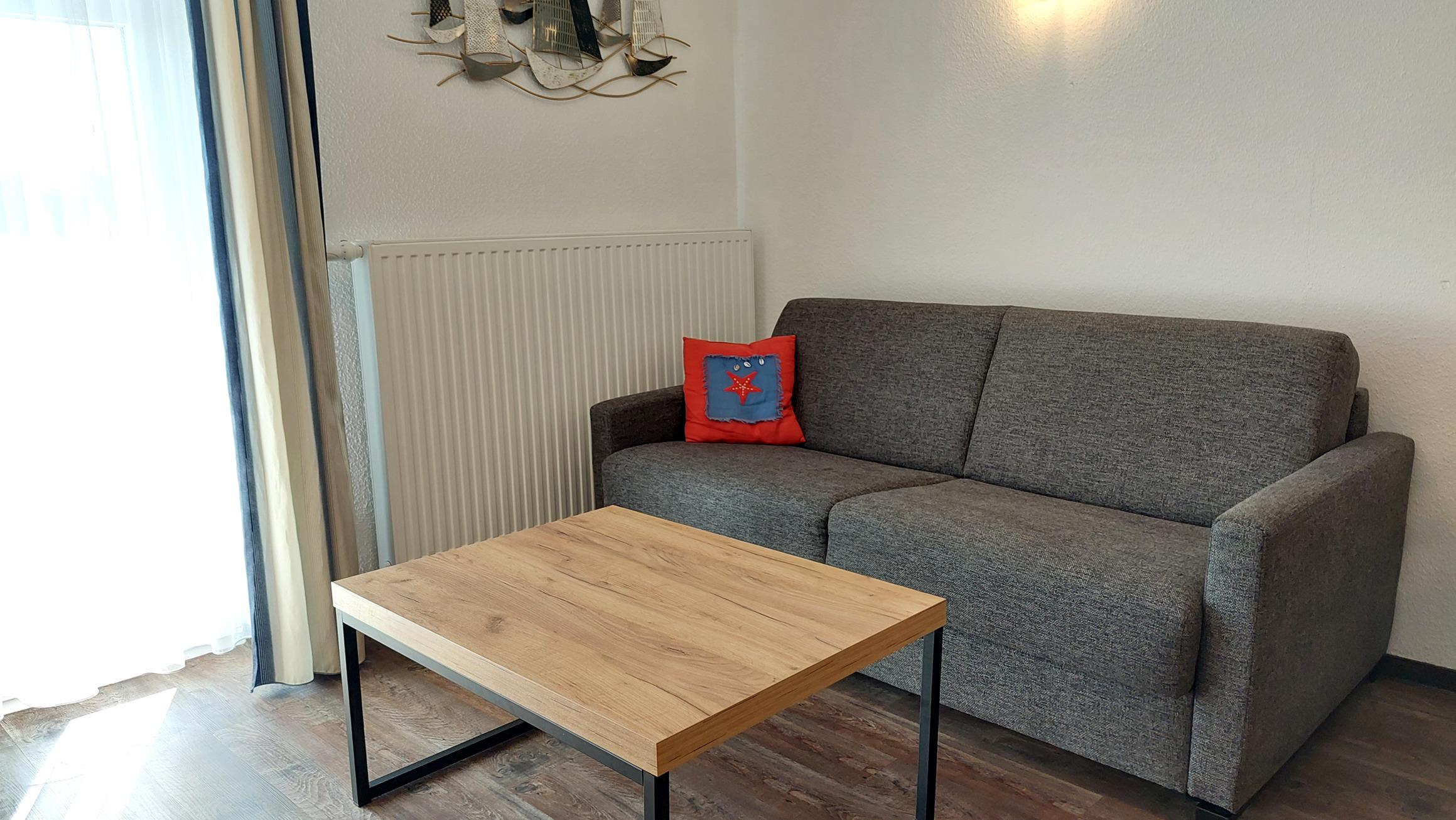 Diese freundliche Wohnung ist aufgeteilt in einen Wohnraum mit Balkon und integrierter Küchenzeile, ein Schlafzimmer ebenso mit Zugang zum Balkon und ein Duschbad mit Waschtisch und WC. Das Wohnzimmer begrüßt Sie mit einem Schlafsofa und Sessel sowie Flachbild-TV. Das Schlafzimmer verfügt über ein Doppelbett (1,80m x 2m) sowie einen Kleiderschrank. Die Küchenzeile ist mit Backofen, Geschirrspüler, Cerankochfeld, Kühlschrank mit kleinem Gefrierfach, Cerankochfeld, Mikrowelle, Kaffeemaschine, Wasserkocher und Toaster ausgestattet. Highlights: Kostenfreies WLAN sowie ein frei wählbarer PKW-Stellplatz direkt am Haus.