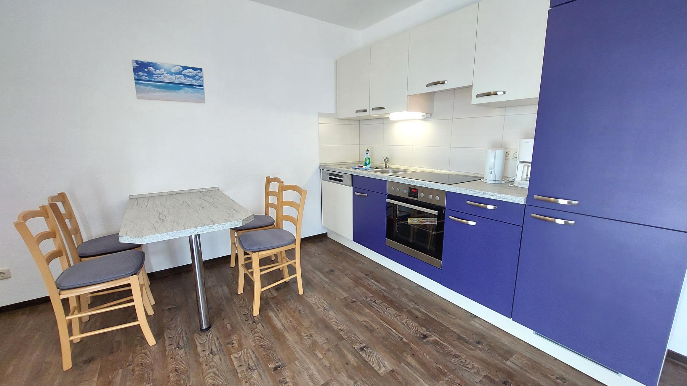 Diese freundliche Wohnung ist aufgeteilt in einen Wohnraum mit Balkon und integrierter Küchenzeile, ein Schlafzimmer und ein Duschbad mit Waschtisch und WC. Das Wohnzimmer begrüßt Sie mit einem Schlafsofa und Sessel sowie Flachbild-TV. Das Schlafzimmer verfügt über ein Doppelbett (1,80m x 2m) sowie einen Kleiderschrank. Die Küchenzeile ist mit Backofen, Geschirrspüler, Cerankochfeld, Kühlschrank mit kleinem Gefrierfach, Cerankochfeld, Mikrowelle, Kaffeemaschine, Wasserkocher und Toaster ausgestattet. Highlights: Kostenfreies WLAN sowie ein frei wählbarer PKW-Stellplatz direkt am Haus.