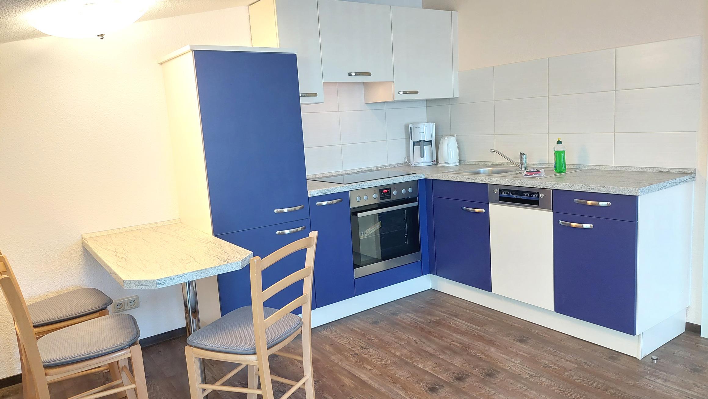Diese freundliche Wohnung ist aufgeteilt in einen Wohnraum mit Balkon und integrierter Küchenzeile, ein Schlafzimmer ebenso mit Balkon und ein Duschbad mit Waschtisch und WC. Das Wohnzimmer begrüßt Sie mit einem Schlafsofa und Sessel sowie Flachbild-TV. Das Schlafzimmer verfügt über ein Doppelbett (1,80m x 2m) sowie einen Kleiderschrank. Die Küchenzeile ist mit Backofen, Geschirrspüler, Cerankochfeld, Kühlschrank mit kleinem Gefrierfach, Cerankochfeld, Mikrowelle, Kaffeemaschine, Wasserkocher und Toaster ausgestattet. Highlights: Kostenfreies WLAN sowie ein frei wählbarer PKW-Stellplatz direkt am Haus.