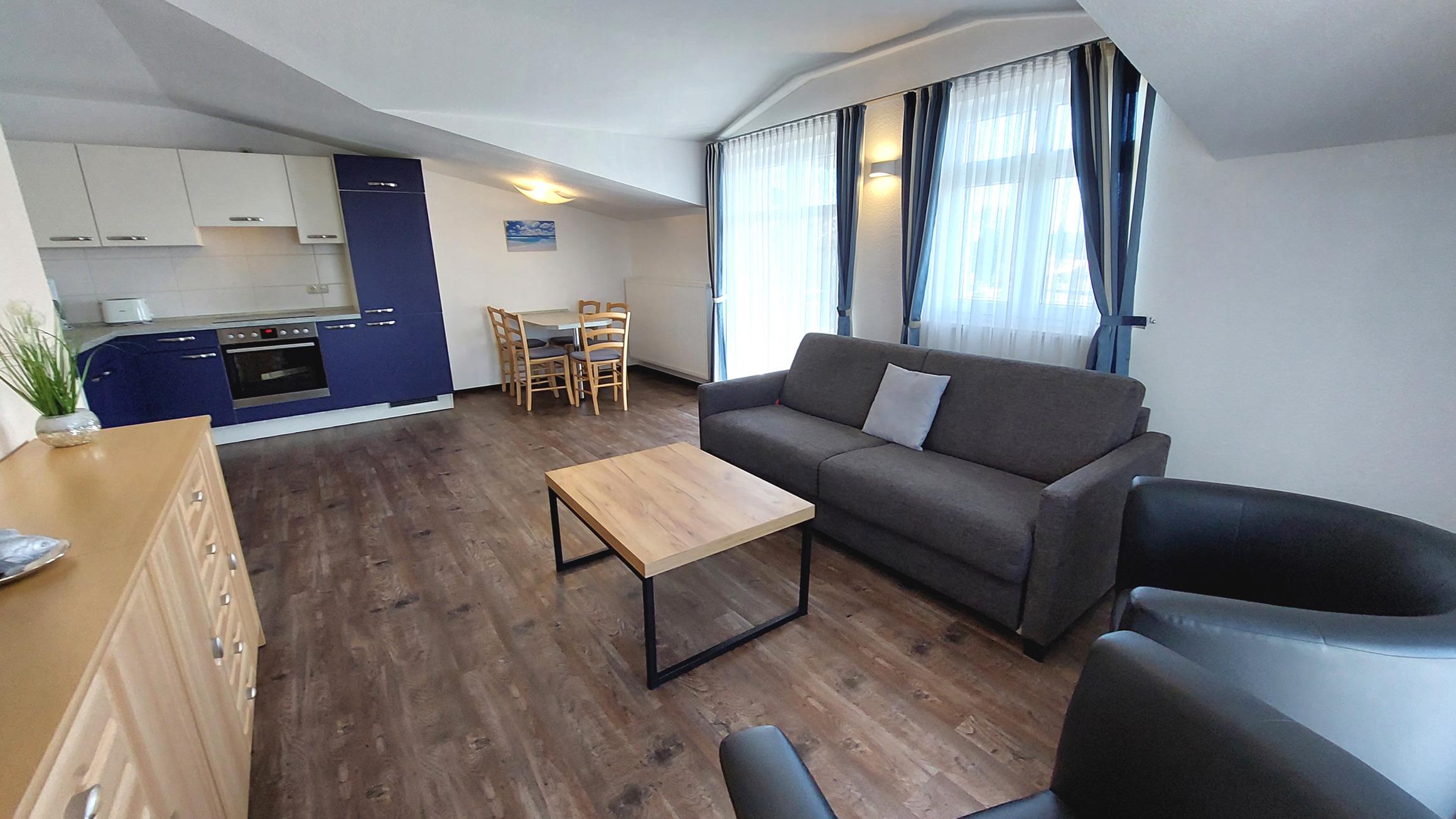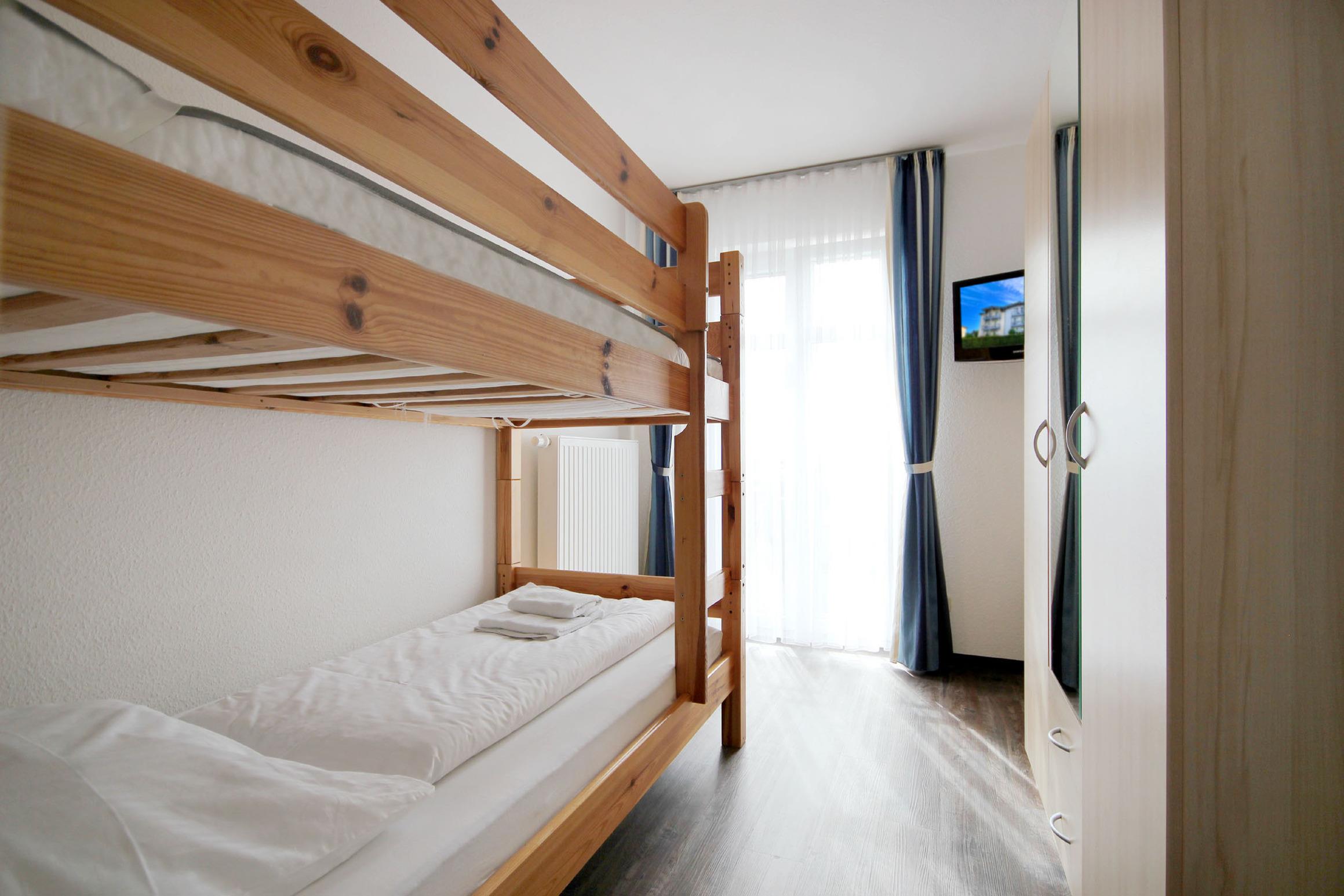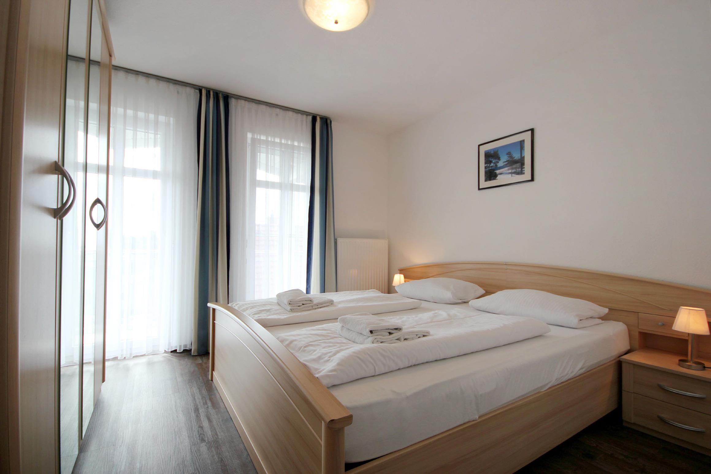 Diese freundliche Wohnung ist aufgeteilt in einen Wohnraum mit Balkon und integrierter Küchenzeile, zwei Schlafzimmer und ein Bad mit Badewanne, Waschtisch und WC. Das Wohnzimmer begrüßt Sie mit einem Schlafsofa und Sessel sowie Flachbild-TV. Das Hauptschlafzimmer verfügt über ein Doppelbett (1,80m x 2m), zusätzlichem Balkon sowie einen Kleiderschrank. Der zweite Schlafraum begrüßt Sie mit einem Etagenbett, Kleiderschrank und TV. Die Küchenzeile ist mit Backofen, Geschirrspüler, Cerankochfeld, Kühlschrank mit kleinem Gefrierfach, Cerankochfeld, Mikrowelle, Kaffeemaschine, Wasserkocher und Toaster ausgestattet. Highlights: Kostenfreies WLAN sowie ein frei wählbarer PKW-Stellplatz direkt am Haus.