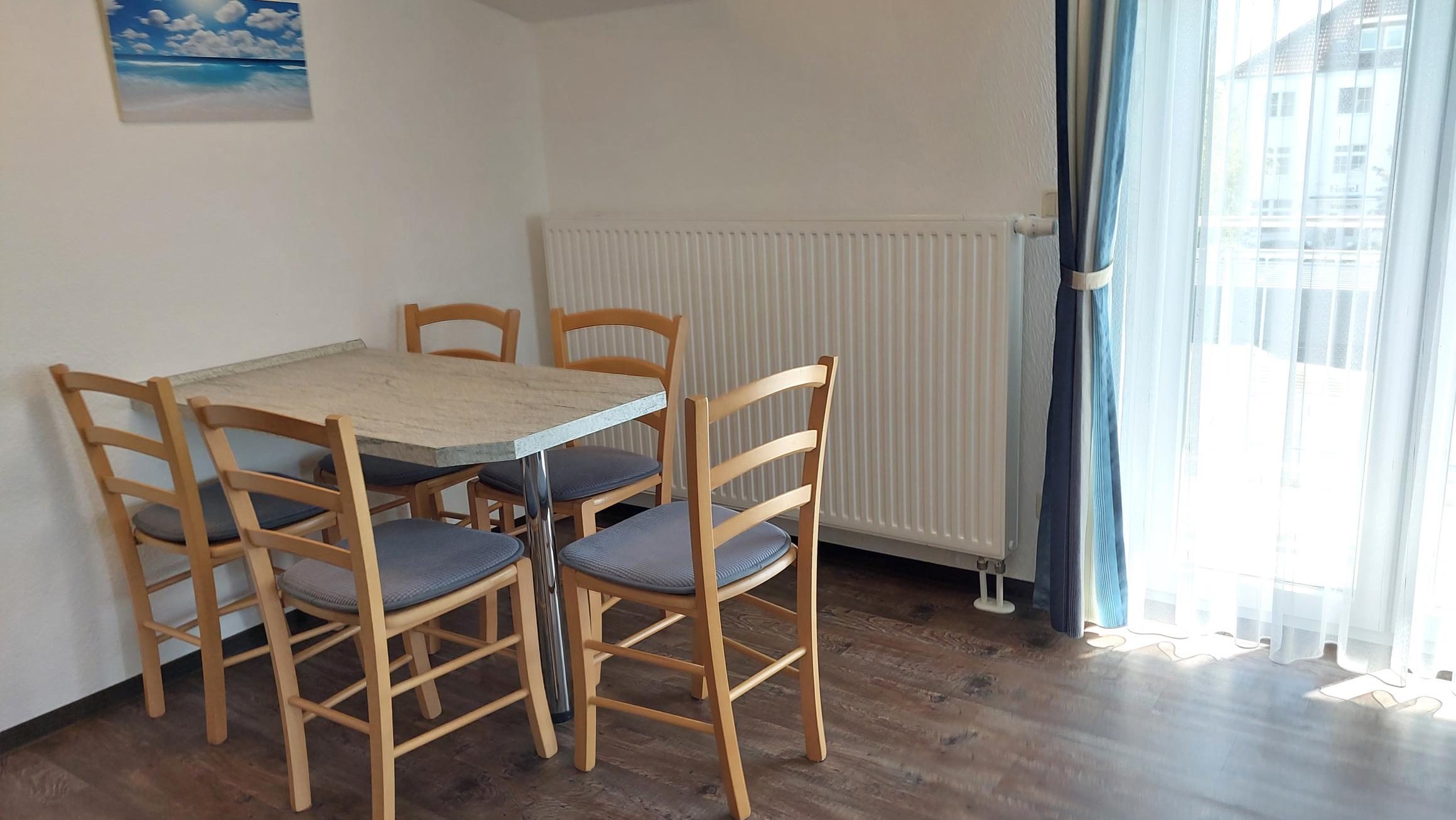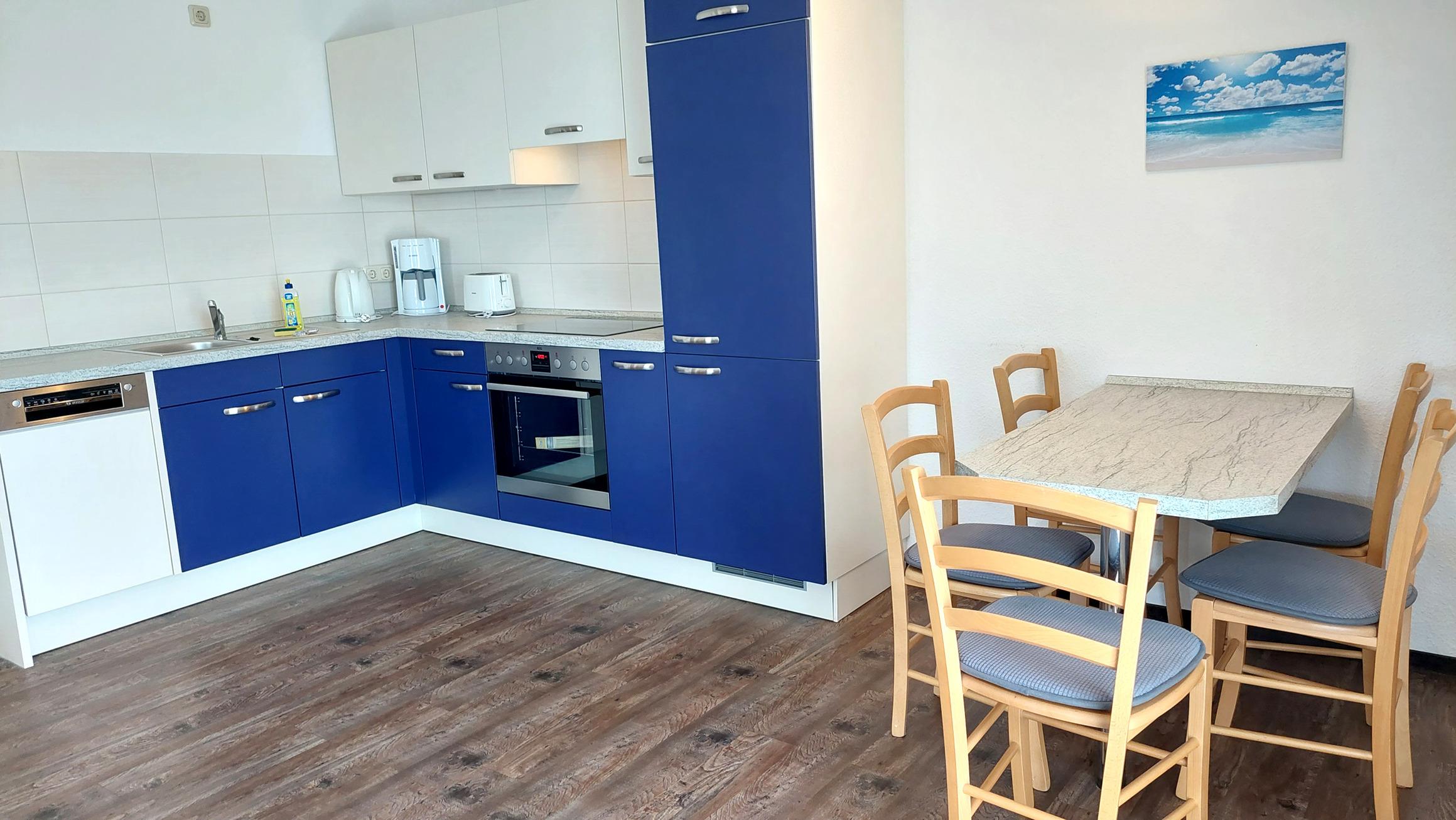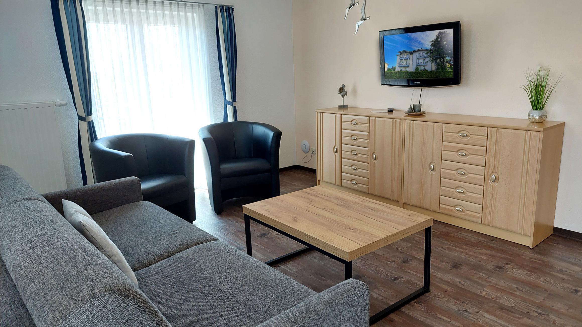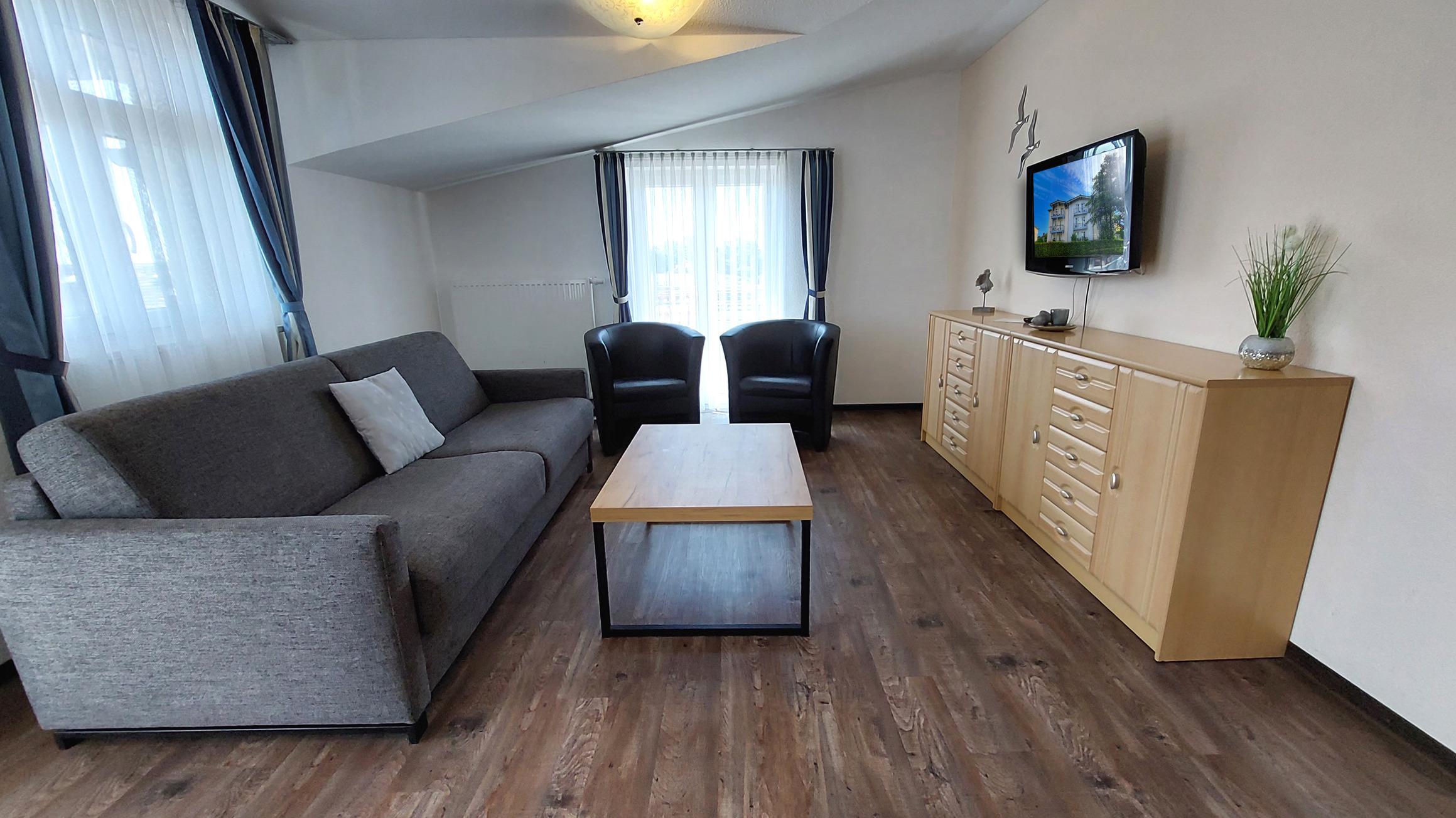 Diese freundliche Wohnung ist aufgeteilt in einen Wohnraum mit Balkon und integrierter Küchenzeile, zwei Schlafzimmer und ein Bad mit Badewanne, Waschtisch und WC. Das Wohnzimmer begrüßt Sie mit einem Schlafsofa und Sessel sowie Flachbild-TV. Das Hauptschlafzimmer verfügt über ein Doppelbett (1,80m x 2m), zusätzlichem Balkon sowie einen Kleiderschrank. Der zweite Schlafraum begrüßt Sie mit einem Etagenbett, Kleiderschrank und TV. Die Küchenzeile ist mit Backofen, Geschirrspüler, Cerankochfeld, Kühlschrank mit kleinem Gefrierfach, Cerankochfeld, Mikrowelle, Kaffeemaschine, Wasserkocher und Toaster ausgestattet. Highlights: Kostenfreies WLAN sowie ein frei wählbarer PKW-Stellplatz direkt am Haus.