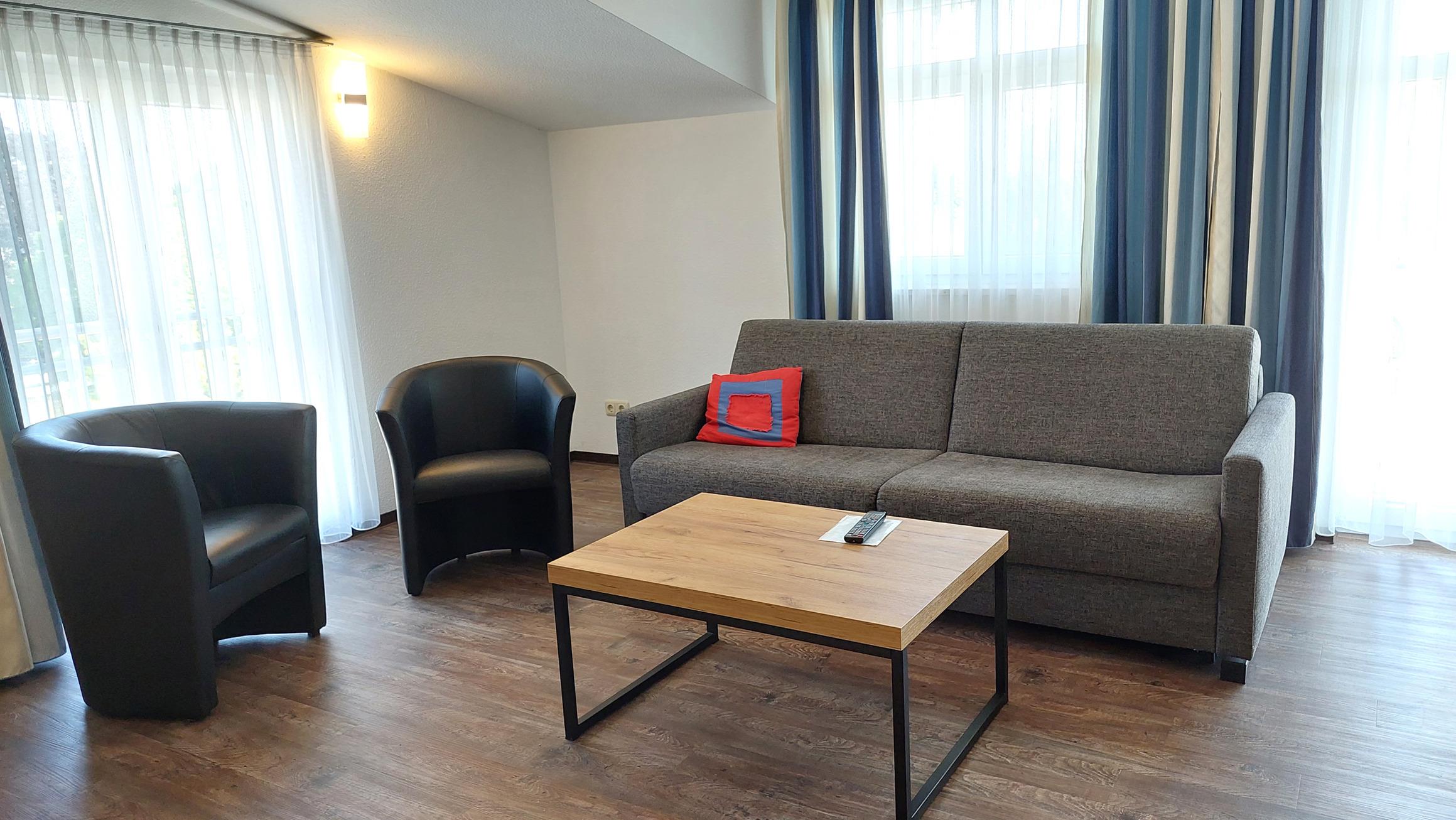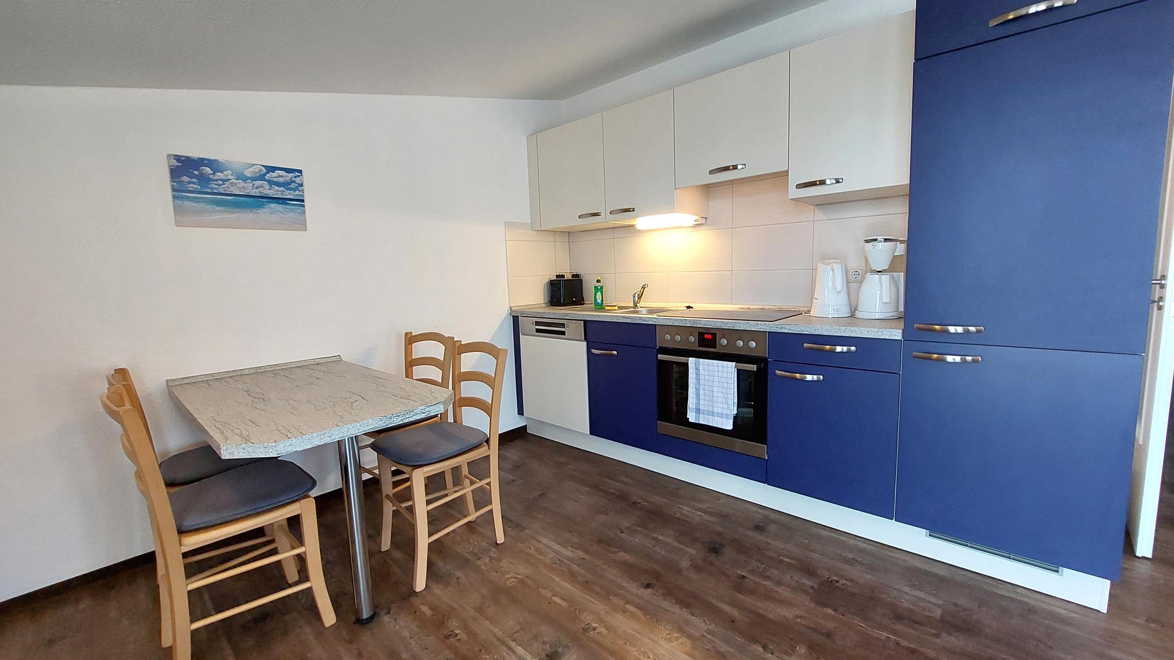 Diese freundliche Wohnung ist aufgeteilt in einen Wohnraum mit Balkon und integrierter Küchenzeile, ein Schlafzimmer und ein Duschbad mit Waschtisch und WC. Das Wohnzimmer begrüßt Sie mit einem Schlafsofa und Sessel sowie Flachbild-TV. Das Schlafzimmer verfügt über ein Doppelbett (1,80m x 2m) sowie einen Kleiderschrank. Die Küchenzeile ist mit Backofen, Geschirrspüler, Cerankochfeld, Kühlschrank mit kleinem Gefrierfach, Cerankochfeld, Mikrowelle, Kaffeemaschine, Wasserkocher und Toaster ausgestattet. Highlights: Kostenfreies WLAN sowie ein frei wählbarer PKW-Stellplatz direkt am Haus.