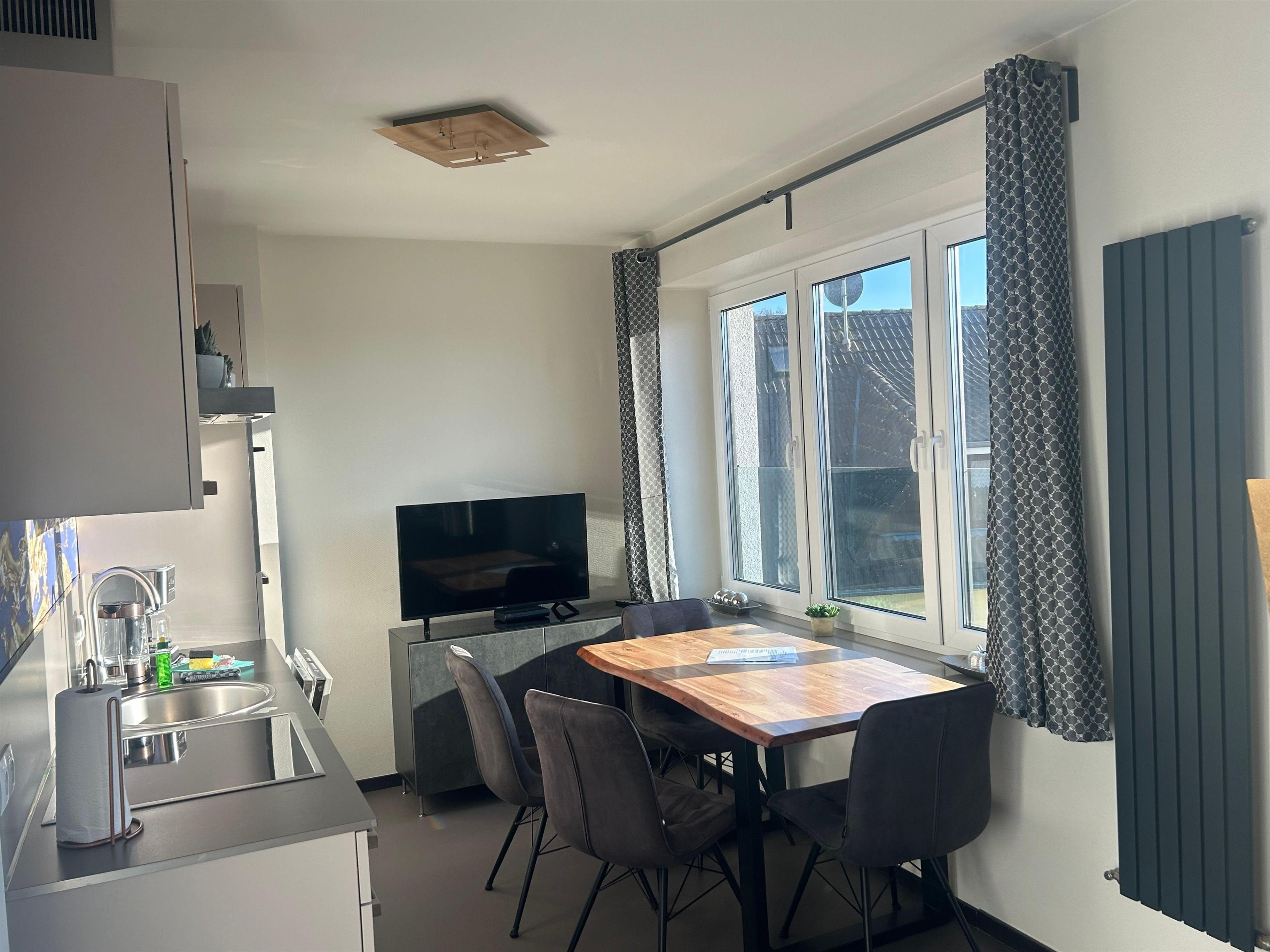 Ca. 57 qm große stilvolle Ferienwohnung EG mit großzügigem Balkon, bis zu 4 Personen, Hunde Willkommen, Teil-Meerblick, ideal für Paare und Familien, die Meer und Natur genießen möchten, 3 Zimmer, Parkplatz, Fahrradschuppen. 4–6 Gehminuten Strand