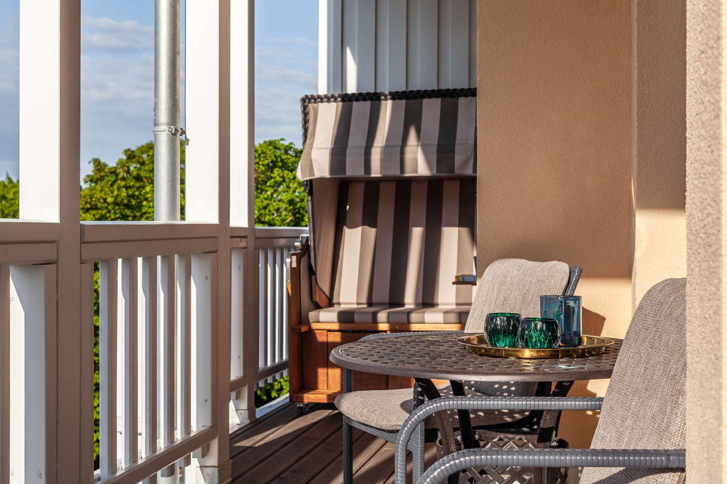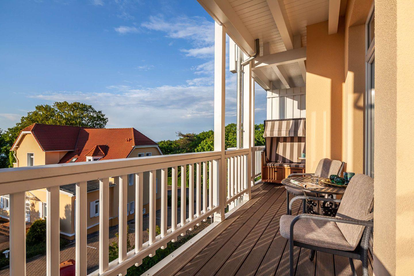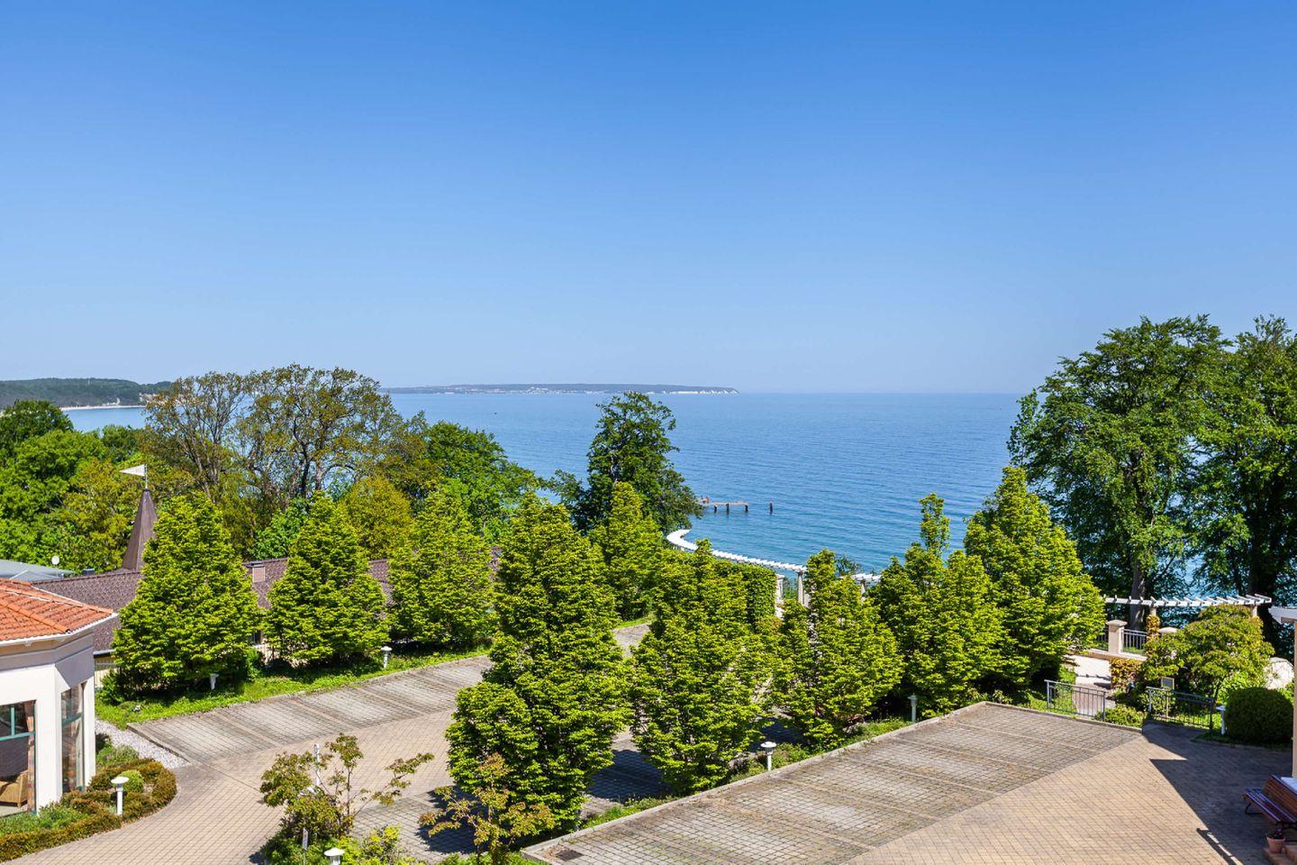 Die komfortabel und hochwertig ausgestattete 2-Zimmer-Ferienwohnung für zwei Personen (54 Quadratmeter Wohnfläche) lässt keine Wünsche offen - Villencharme pur! Die Wohnung ist mit 4 Sternen (DTV) klassifiziert. Ein großer, überdachter Balkon (12 Quadratmeter) zur Seeseite mit Strandkorb lädt zum Verweilen ein. Ruhige, exponierte Lage über den Dächern Göhrens. Die Wohnung liegt 30 m über dem Hochufer, rund 100 m vom Ostseestrand entfernt - Meeresrauschen inklusive!