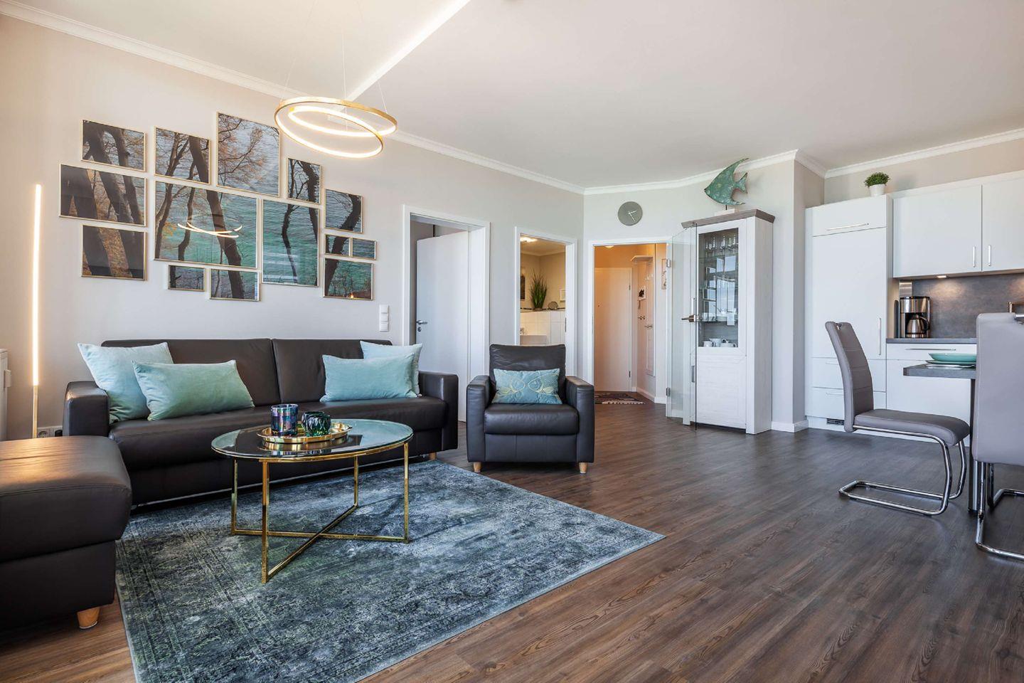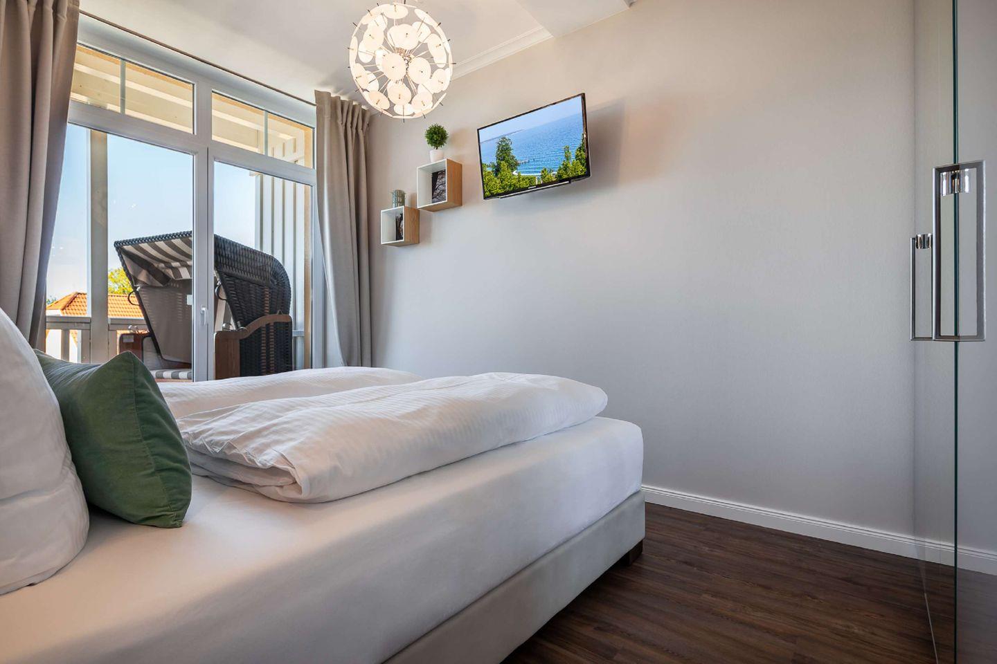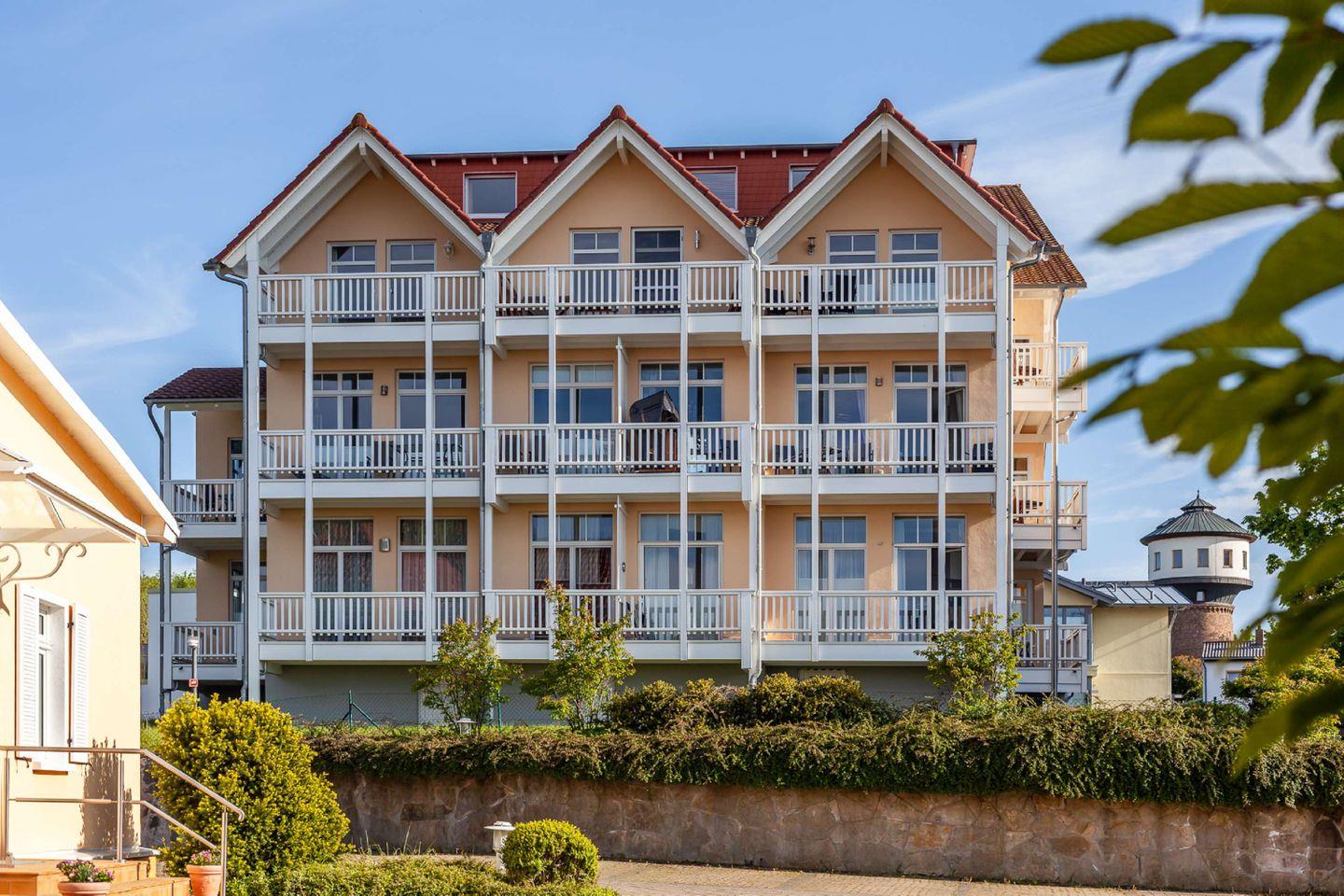 Die komfortabel und hochwertig ausgestattete 2-Zimmer-Ferienwohnung für zwei Personen (54 Quadratmeter Wohnfläche) lässt keine Wünsche offen - Villencharme pur! Die Wohnung ist mit 4 Sternen (DTV) klassifiziert. Ein großer, überdachter Balkon (12 Quadratmeter) zur Seeseite mit Strandkorb lädt zum Verweilen ein. Ruhige, exponierte Lage über den Dächern Göhrens. Die Wohnung liegt 30 m über dem Hochufer, rund 100 m vom Ostseestrand entfernt - Meeresrauschen inklusive!