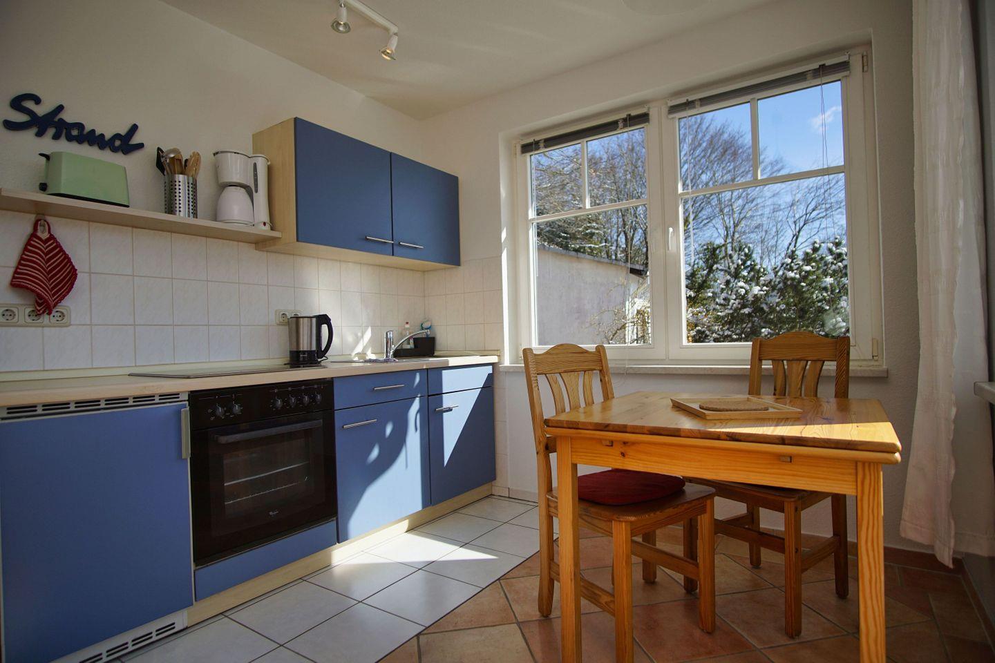 KÜCHE // Küchenzeile, 4-Platten-Herd, Kühlschrank, Backofen, Toaster, Wasserkocher, Kaffeemaschine, reichlich Besteck, Geschirr und Küchenutensilien ++
