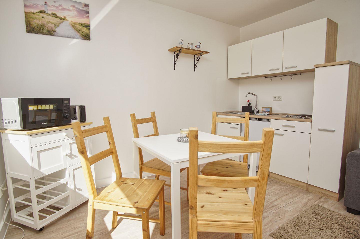 KÜCHE // offene Küche mit Esstisch, 2-Platten-Herd, Mikrowelle, Kühlschrank, Toaster, Wasserkocher, Kaffeemaschine, reichlich Besteck, Geschirr und Küchenutensilien ++