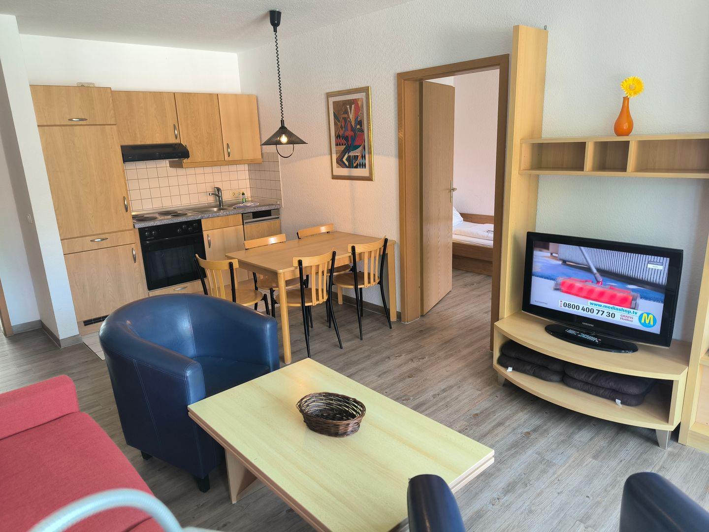 Wohnbereich mit moderner Wohnlandschaft, Couchtisch, TV mit Radiofunktion und Esstisch mit 4 Stühlen