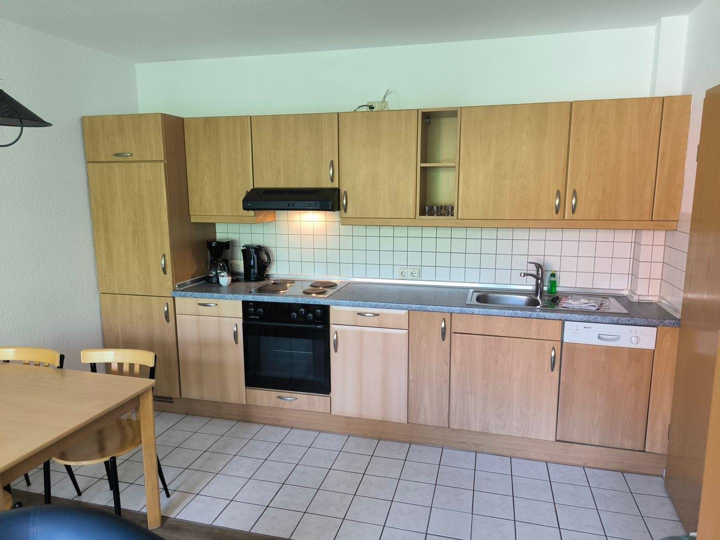 In den Wohnraum integrierte Einbauküche mit 4- Platten- Kochfeld, Backofen, Kühlschrank, Geschirrspüler, Toaster, Kaffeemaschine, Wasserkocher und Küchenutensilien