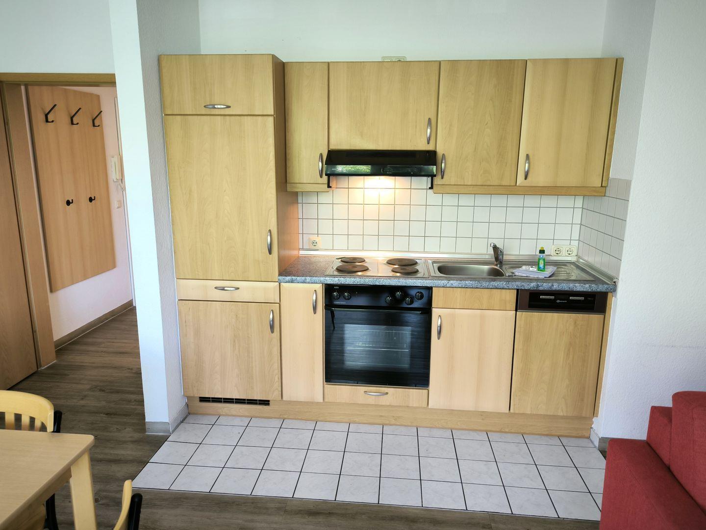 Im Wohnraum integrierte Einbauküche, ausgestattet mit: 4- Platten- Kochfeld, Backofen, Kühlschrank, Geschirrspüler, Toaster, Kaffeemaschine, Wasserkocher und Küchenutensilien
