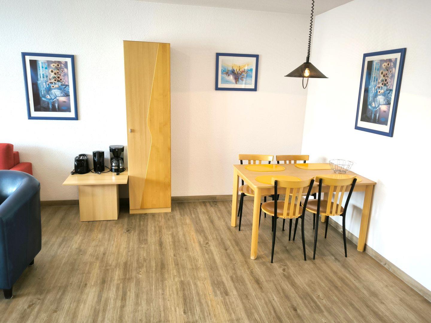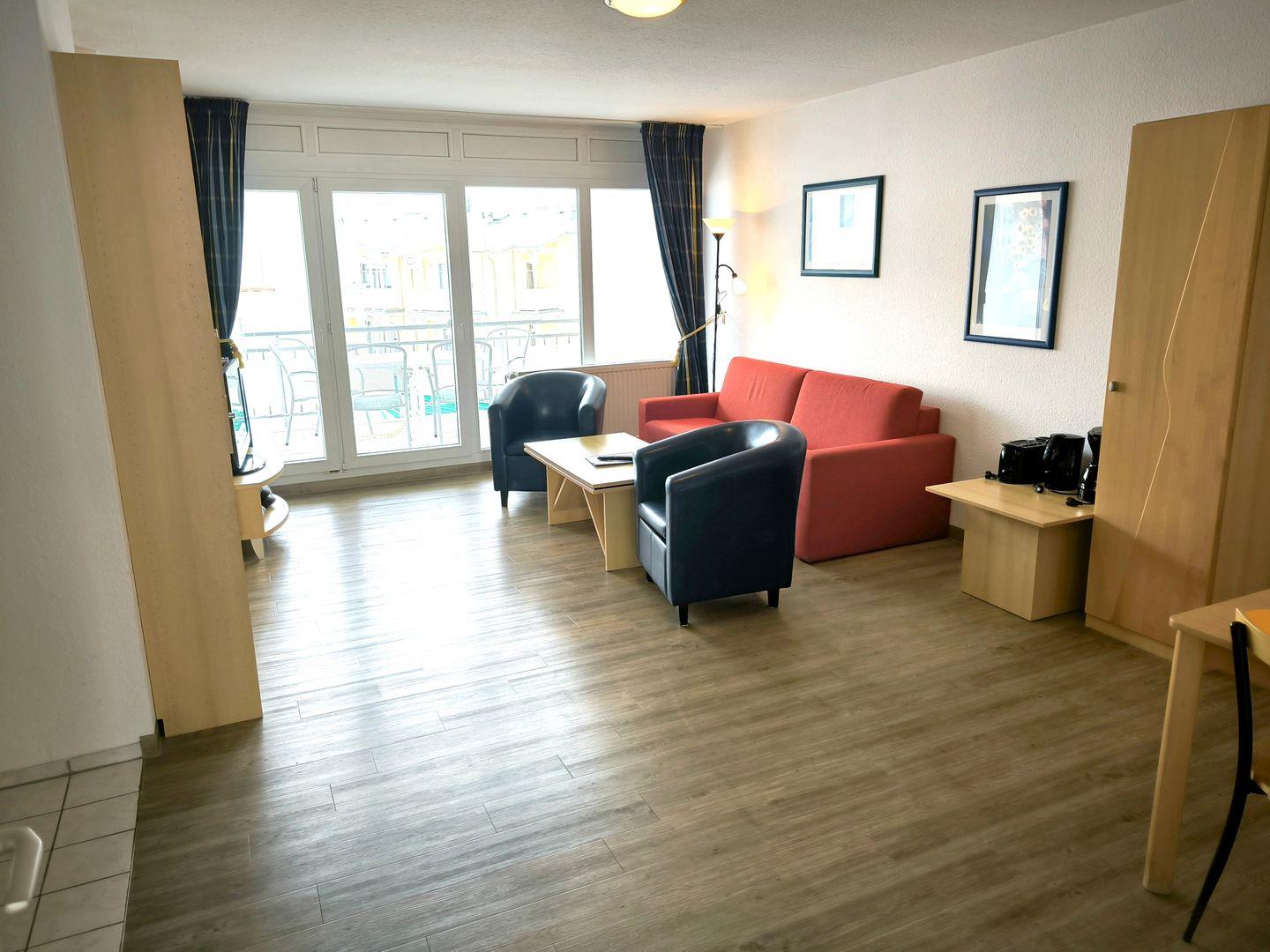 Wohnbereich mit ausziehbarer Doppelbettschlafcouch (170 x 200 cm), 2 Sesseln, Couchtisch, TV mit Radiofunktion und Esstisch mit 4 Stühlen