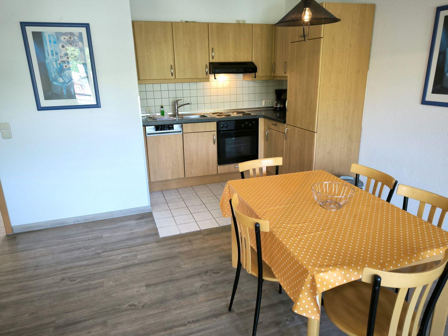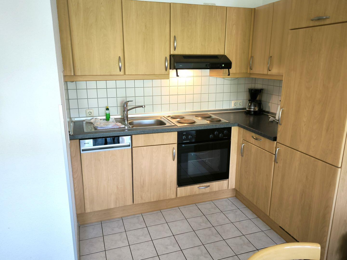 Im Wohnraum integrierte Einbauküche, ausgestattet mit: 4- Platten- Kochfeld, Backofen, Kühlschrank, Geschirrspüler, Toaster, Kaffeemaschine, Wasserkocher und Küchenutensilien