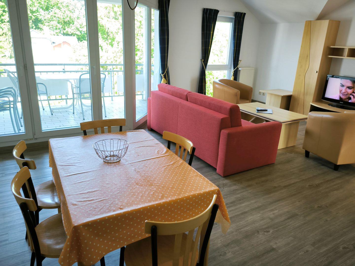 Wohnbereich mit moderner Wohnlandschaft, Couchtisch, Anrichte mit Flat-TV (integr. Radiofunktion) und Esstisch mit 4 Stühlen