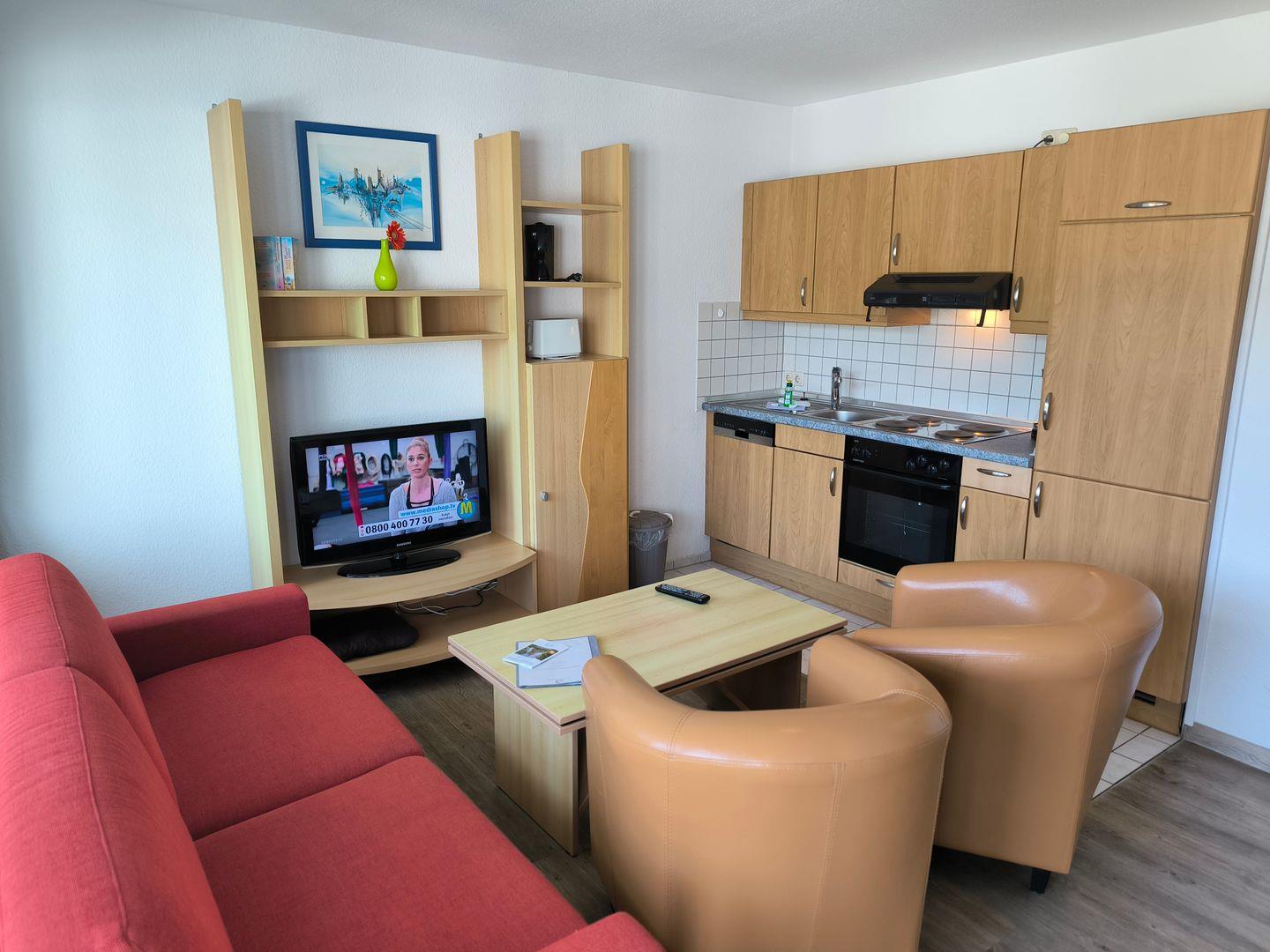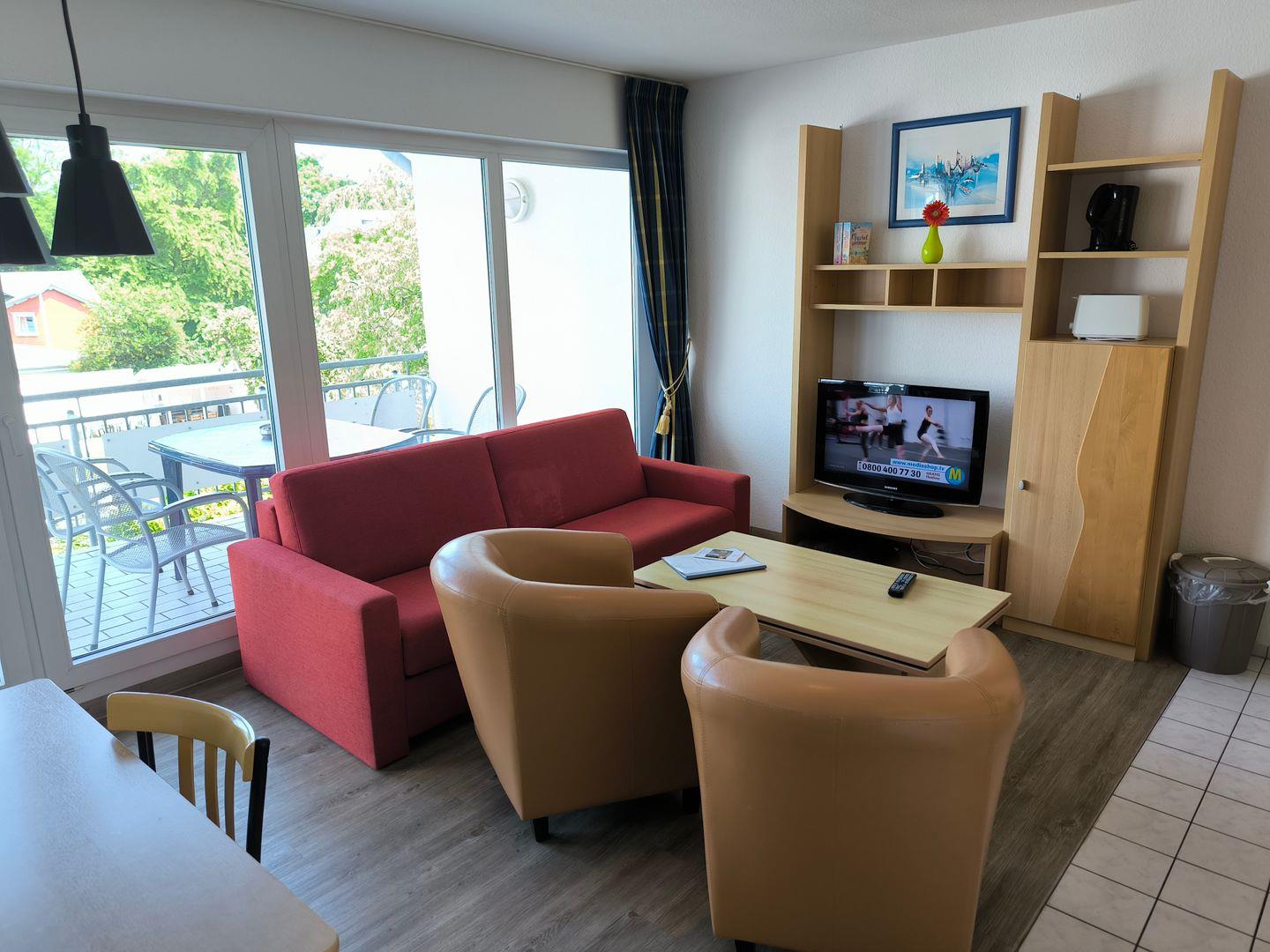 Wohnbereich mit ausziehbarer Doppelbettschlafcouch (170 x 200 cm), 2 Sesseln, Couchtisch, TV mit Radiofunktion und Esstisch mit 4 Stühlen