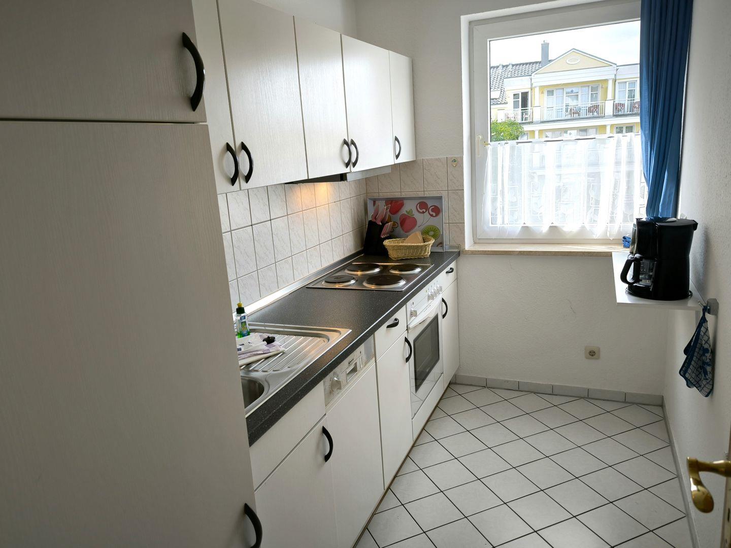 Einbauküche im Wohnbereich integriert, ausgestattet mit: 4-Platten-Kochfeld, Backofen, Dunstabzugshaube, großer Kühlschrank mit Gefrierfach, Geschirrspüler, Toaster, Kaffeemaschine, Wasserkocher und Küchenutensilien