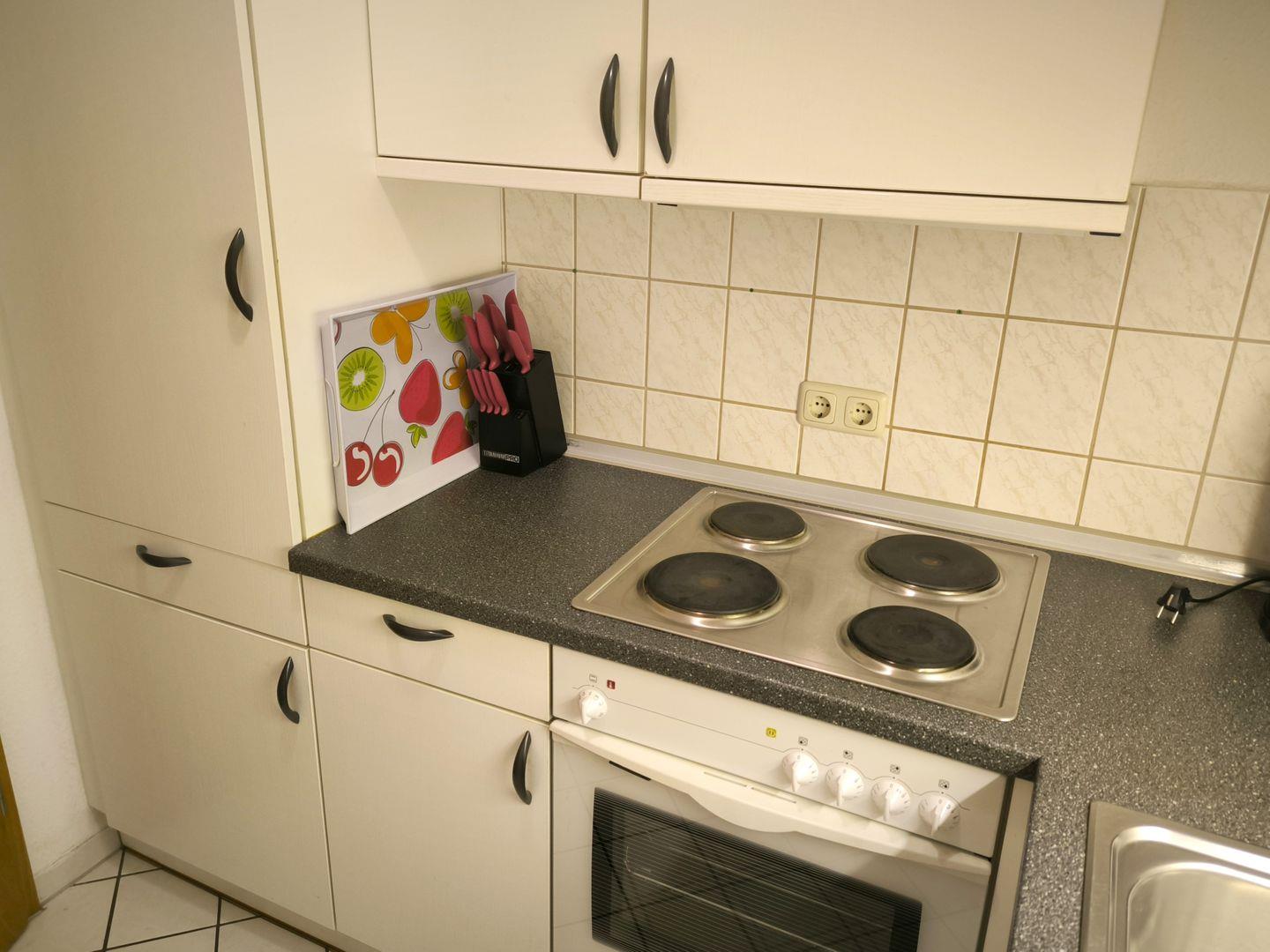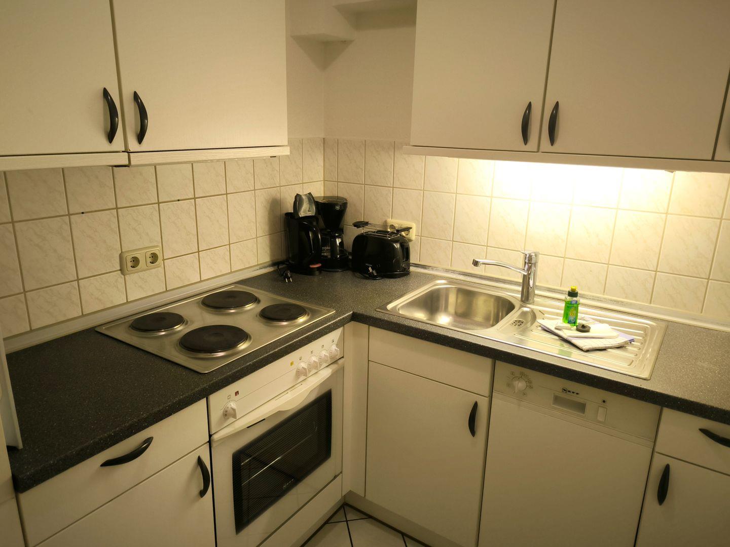 separate Küche, ausgestattet mit: 4- Platten-Kochfeld, Backofen, Dunstabzugshaube, großer Kühlschrank mit Gefrierfach, Geschirrspüler, Toaster, Kaffeemaschine, Wasserkocher und Küchenutensilien