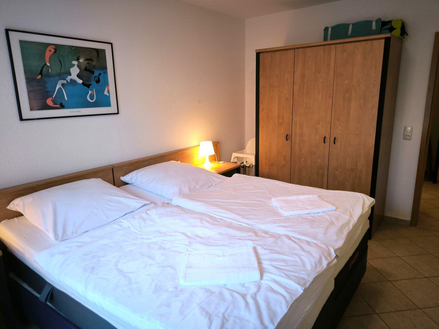 Schlafzimmer mit einem Doppelbett (180 x 200 cm), Nachttischen und großem Kleiderschrank