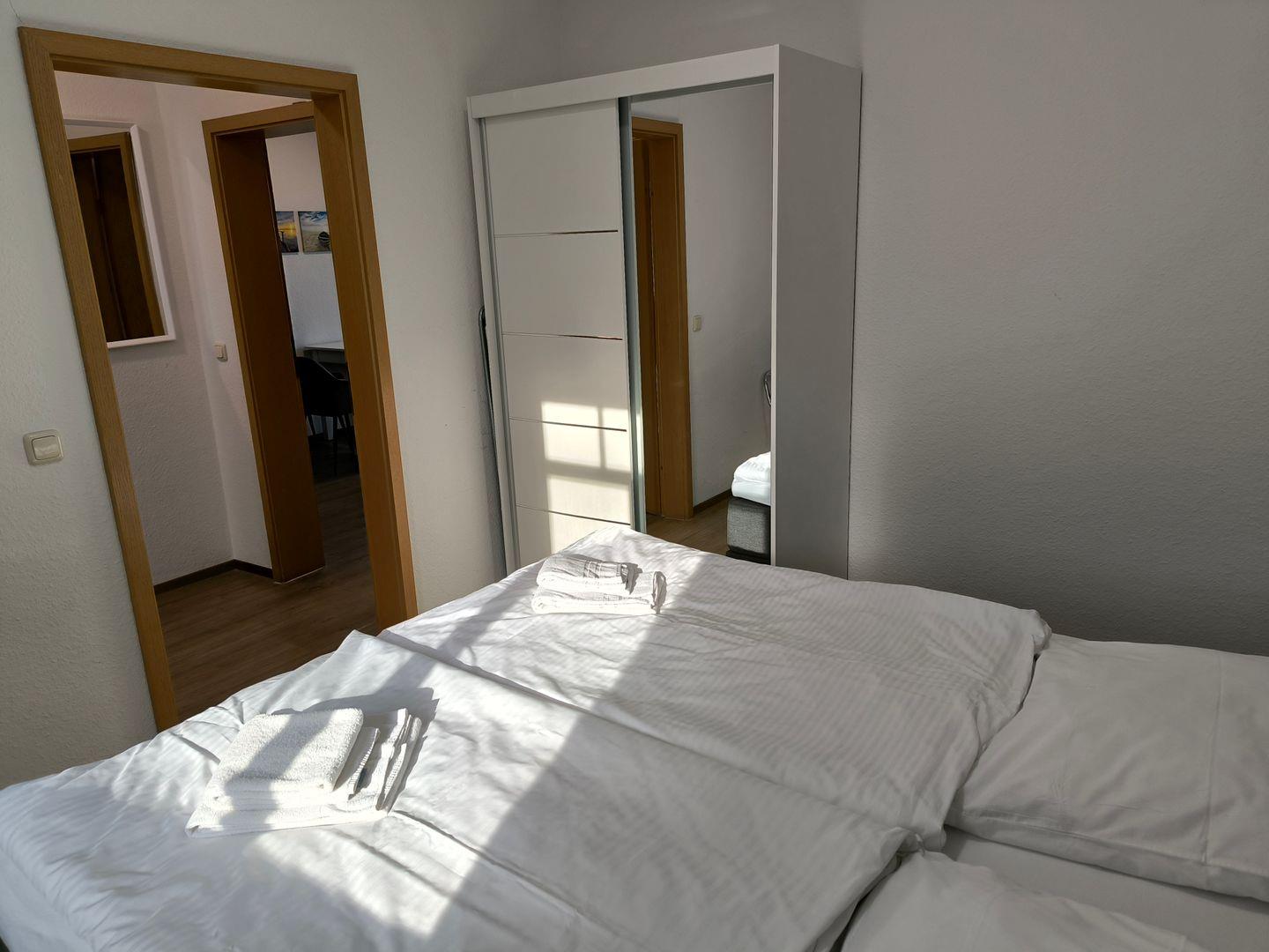 Schlafzimmer mit einem Doppelbett (180 x 200 cm), Nachttischen und großem Schwebetürenschrank und Kofferablage