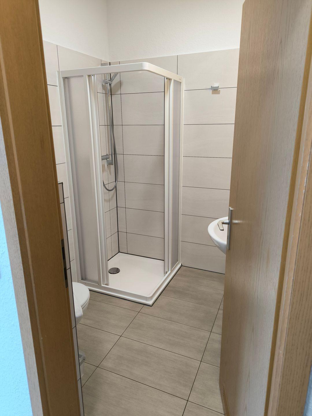 Bad mit Dusche, WC, Föhn und beleuchtetem Kosmetikspiegel